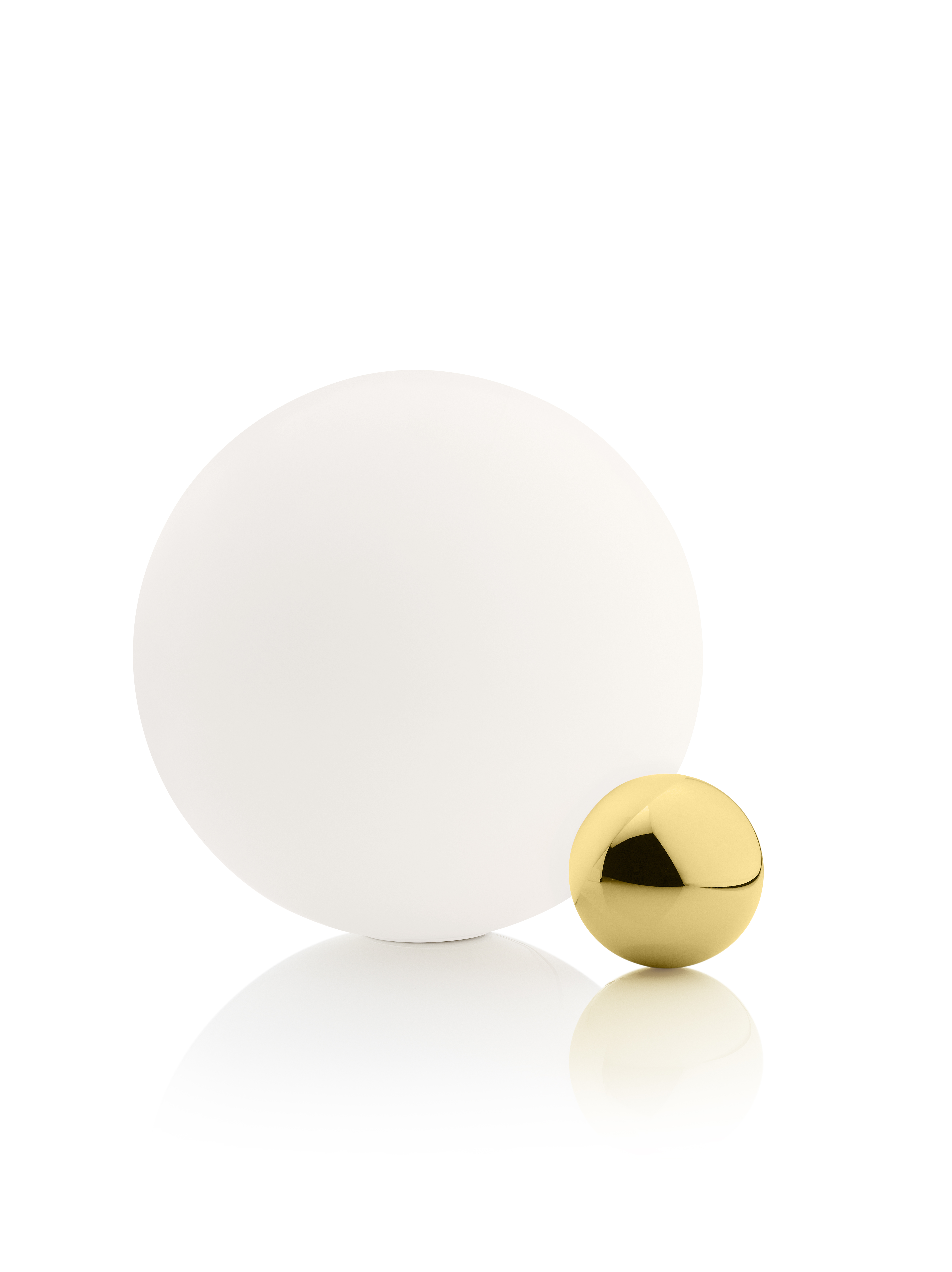 Dvě koule, které se sotva dotýkají. Ta menší ze vzácného materiálu umístěná do stínu té velké z osvětleného skla. Michael Anastassiades