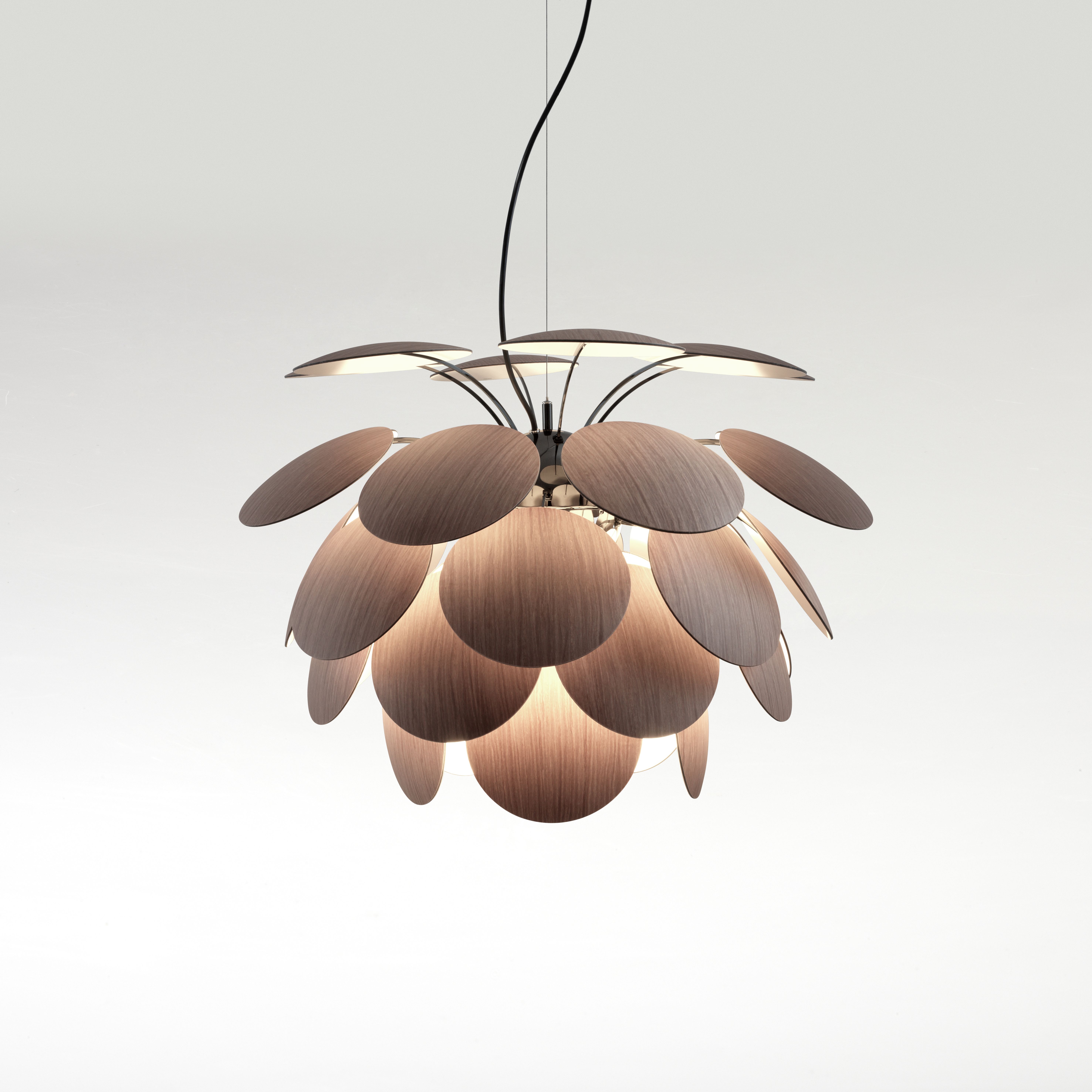 Ikonické svítidlo Discocó z kolekce španělského výrobce Marset se dočkalo nového zpracování. 10 let po svém uvedení na trh se převléklo do dřevěného kabátu. Jednotlivé lístky svítidla nyní nově pokrývá luxusní dubová dýha. Navzdory vizuální těžkopádnosti dřeva si svítidlo zachovává svou lehkost na pohled i fyzicky. Také kovová struktura svítidla dostala nový, grafitový, povrch.