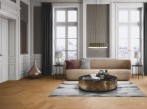 Vzorované podlahy jsou opět relevantní a instalují je lidé s láskou k tradičnímu řemeslnému umění aby vytvořili vzrušující vzhled ve funkčním a puristickém vzhledu moderní architektury. Chevron v Oak Adagio, Oak Adagio white a Oak Animoso.
