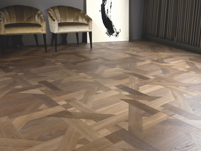 Podlaha z dubových kouřových kazet, které jsou ručně skládány a kartáčovány. Výrobce: Foglie d'Oro