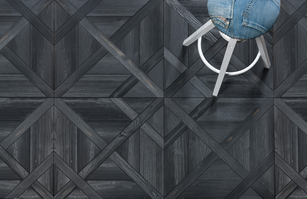 Dřevěná podlaha Vintage Pattern z kolekce "The Geometries" je sbírka, odkazující na minulost. Podlahy s rustikálním a působivým vzhledem, které Bassano Parquet vytváří pomocí barevných olejů a také přirozenou reakcí dřeva dodávají prostorům autentický vzhled.
