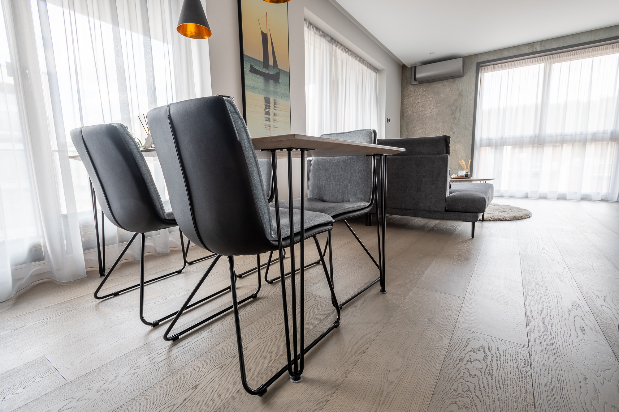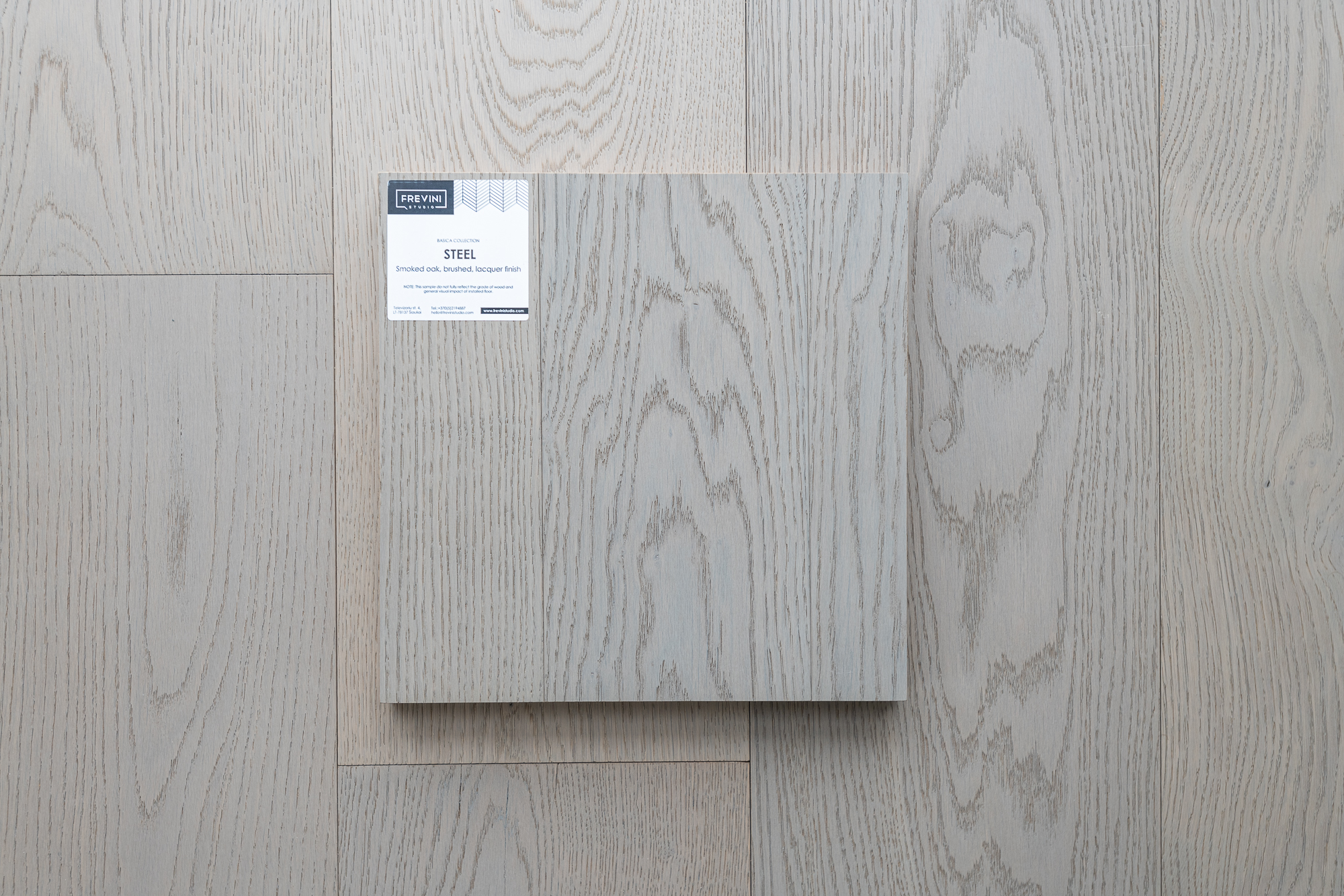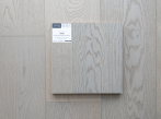 Dubové vrstvené prkno šíře 240 mm, kartáčováno, mořeno do světlešedého odstínu Steel, lakováno.