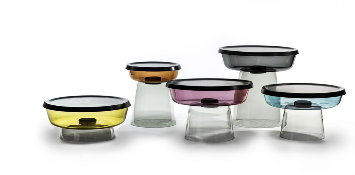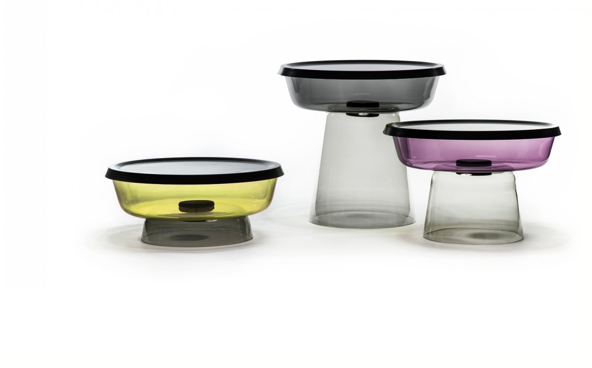 Série pestrých konferenčních stolků z ručně foukaného skla. Stolky jsou realizovány kombinací 4 rozdílných skleněných částí a doplněny dřevěným spojem. Design: Lucie Koldová a Dan Yeffet pro Haymann, 2013