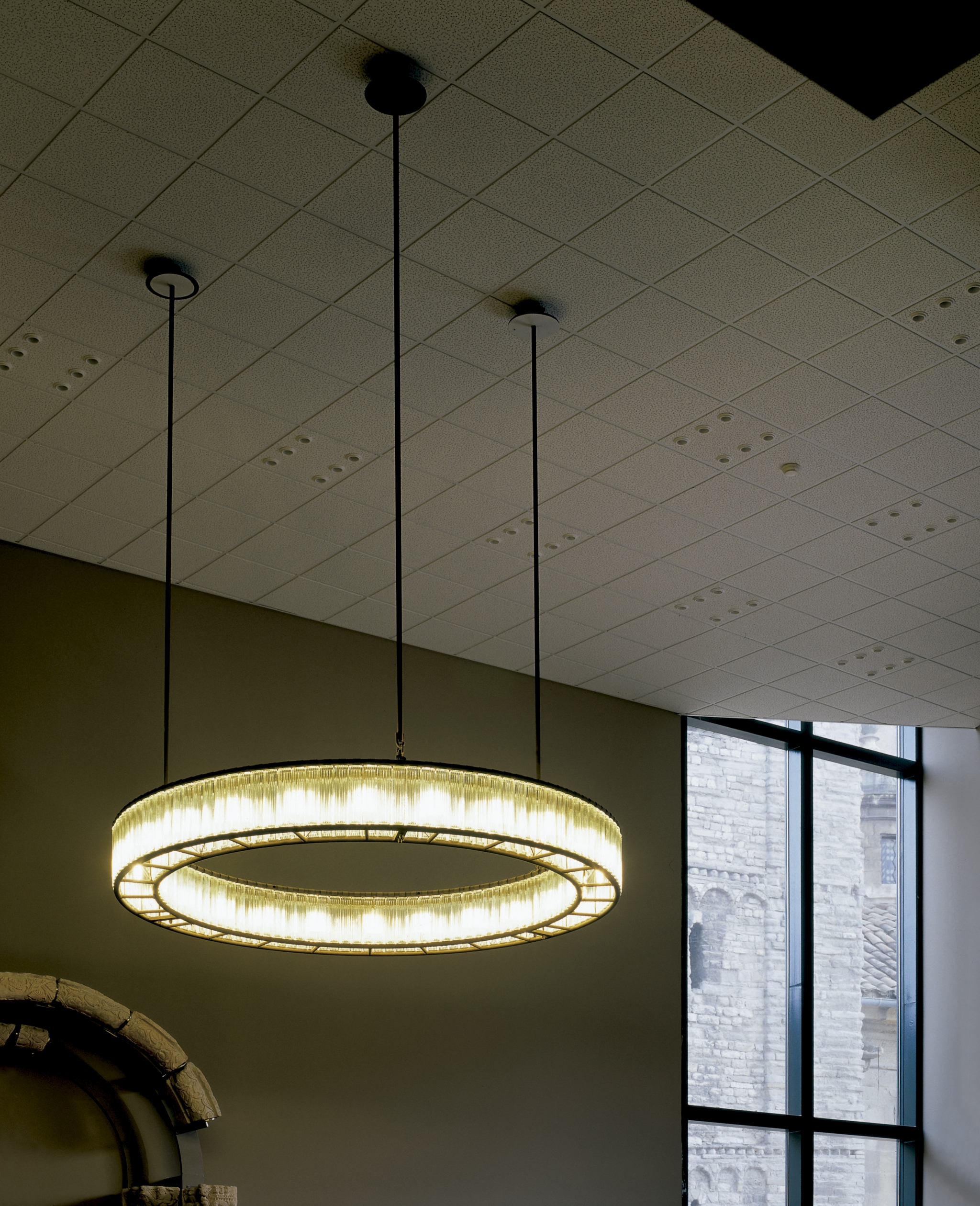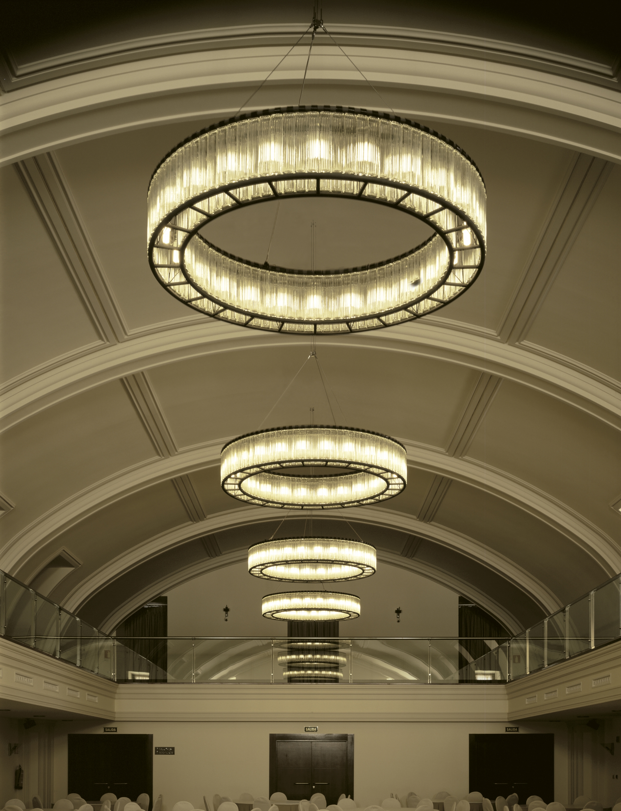 Svítidlo od Santa & Cole bylo navrženo nejprve pro olympijský stadion v Barceloně v roce 1992. Formou připomíná středověké lustry, jemné skleněné krychle mu však dodávají jemnou eleganci.