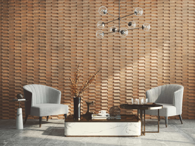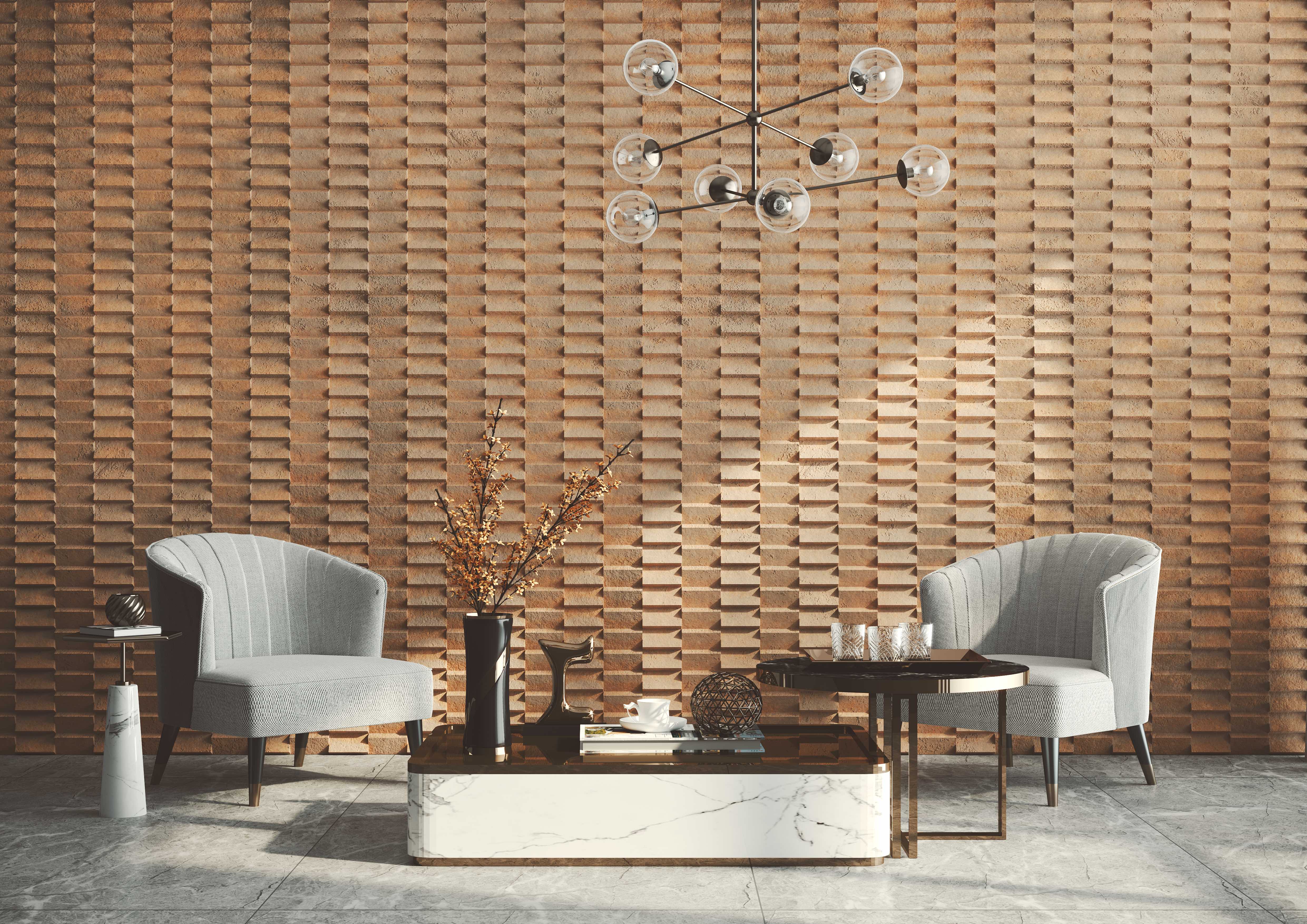 Fitwall ™ nabízí vynikající odolnost a má výraznou estetiku přírodních materiálů, jako je dřevo, beton, pálená hlína a textil. Panely lze použít k vytvoření výrazných reliéfů.