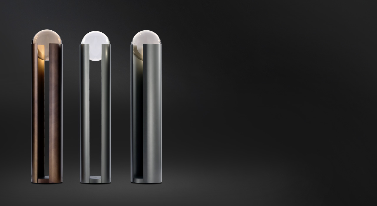 Stolní a stojací lampa je vyrobena z ocelového plátu, s grafitovou nebo bronzovou úpravou, ve kterém je zasazen skleněný foukaný difuzér.