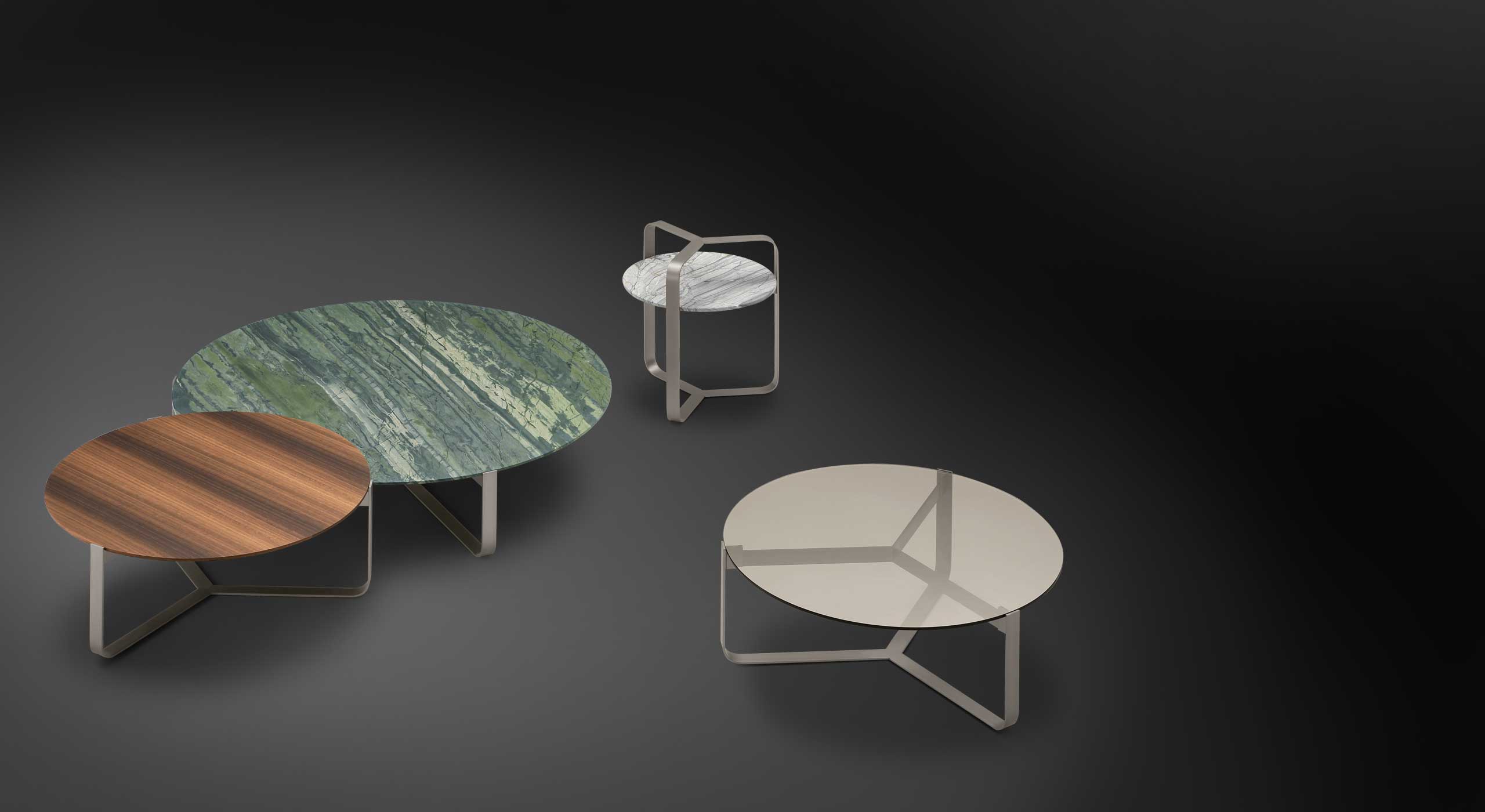 Horní deska je k dispozici z bronzového skla, matně lakovaného eukaliptového dřeva nebo mramoru v mnoha povrchových úpravách.