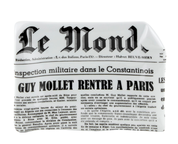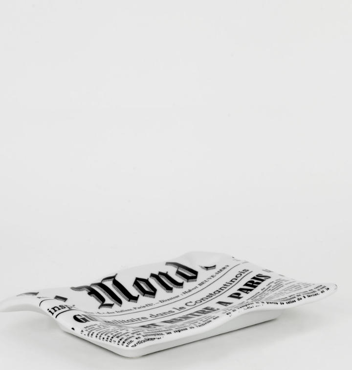 Elegantní a neobyvklý popelník Fornasetti Medium sheet ashtray Giornali Le Monde black/white upoutá pozornost každého! Materiál: porcelán – ručně tištěný motiv, lak. Dodává praguekabinet.