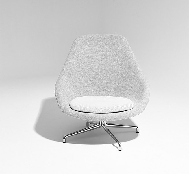Křeslo s vysokými zády kombinuje vysoký stupeň komfortu sezení s příjemným vzhledem. Čtyřcípé otočné podnoží, vyrobené z litého aluminia, nabízí různé možnosti barevného provedení. Skořepina je vždy zaoblená a současně se nachází ve vzpřímené poloze.