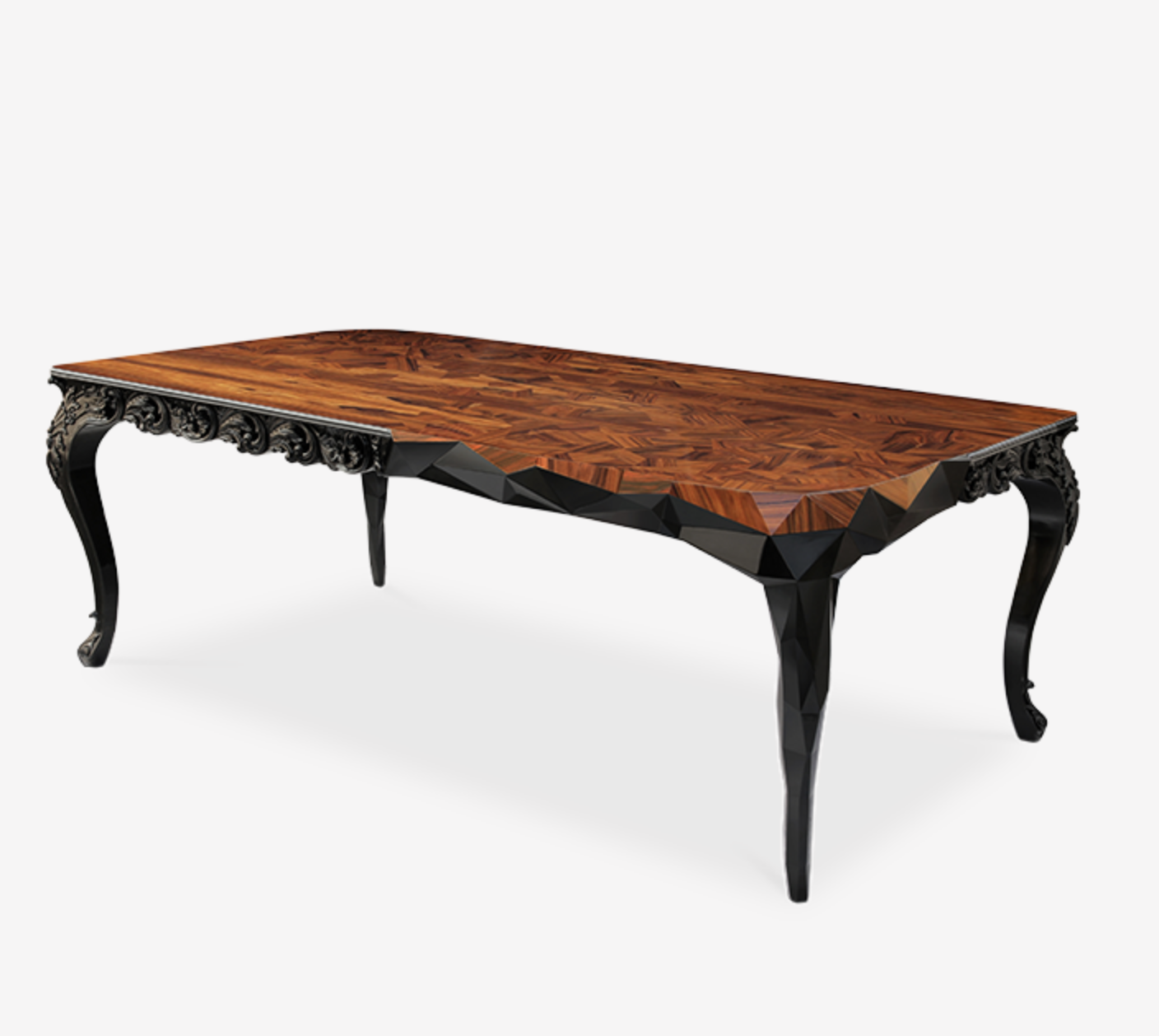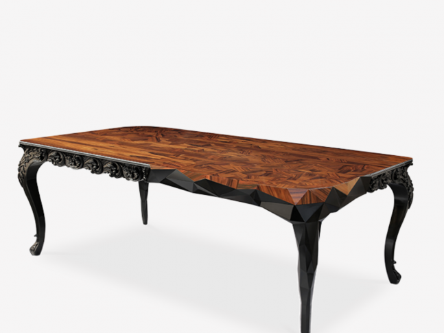 Povrch stolu je povrchově upraven dýhou z palisandru s mozaikou. Nohy jsou zakončeny vysoce lesklým černým lakem.