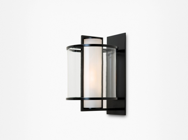 Ručně vyráběné nástěnné svítidlo s kovovým rámem a foukaným skleněným stínidlem.