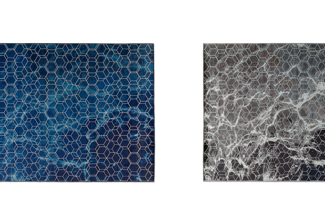 Geometrický vzorek v popředí je pro tento koberec charakteristický. Na pozadí vidíme tekoucí vodu, na kterou odkazuje název "Mizu". Kombinace měkkosti v pozadí a tvrdých grafických čar v popředí vytváří napětí a kontrast.