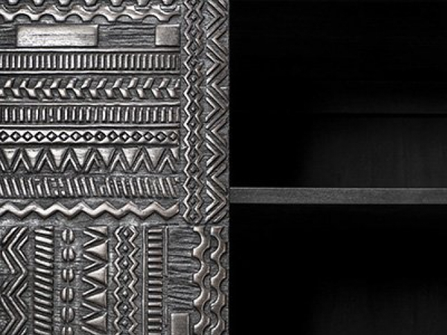 Komoda Tabwa z kolekce Ancestors nabízí nadčasový výrazný design tradičního etnického umění. Inspirována je archaickými geometrickými tvary a symboly nalezenými v kulturách po celém světě, převážne však v Africe. Podnoží skříňky je vyrobené z oceli a dvířka jsou z teakové dýhy, která je ručně vyřezávaná.