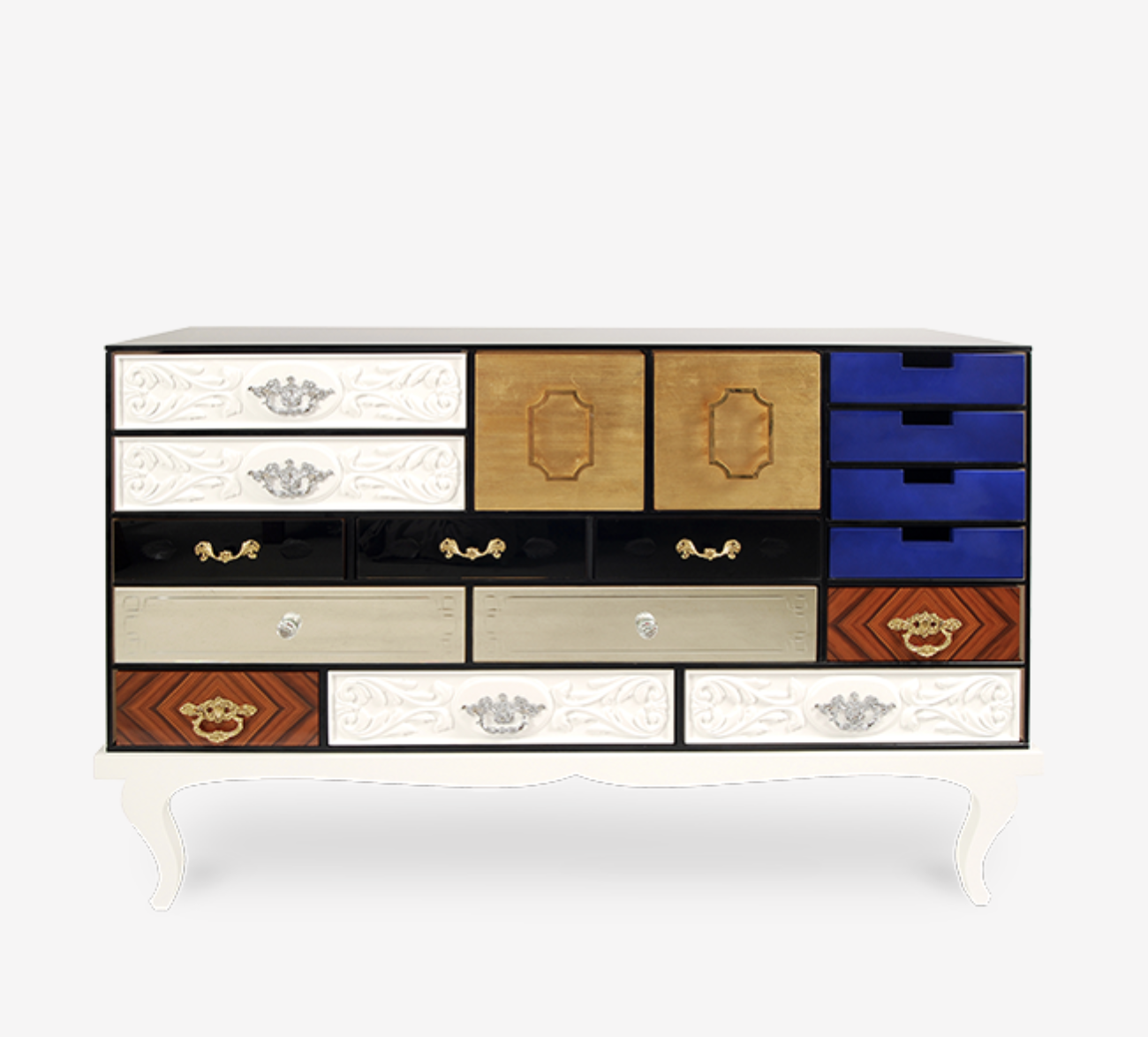 Základny příborníku jsou vyrobeny ze dřeva a tvrzeného skla. Skládá se z 15 zásuvek a dvou dveří. Jeho základna je vyrobena z lakovaného dřeva.