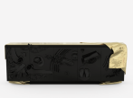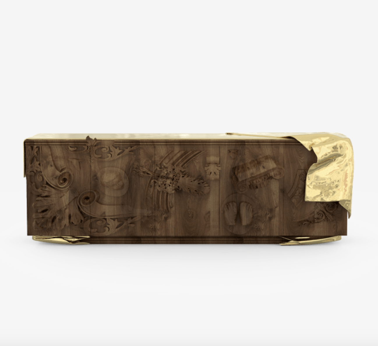 Současná komoda obložený sochařskými panely s dekorativními prvky zakončenými vysokým lesklým lakem. Vrchní záhab je z asymetrického ručně tlučeného zlatého leštěného mosazného plechu na pravé straně vršku.