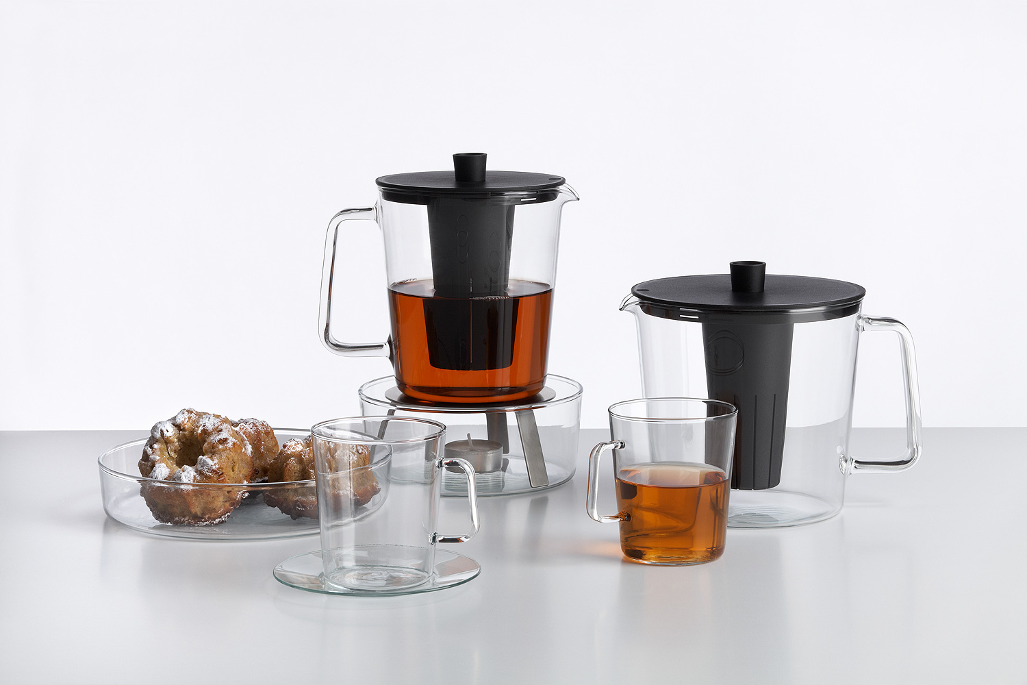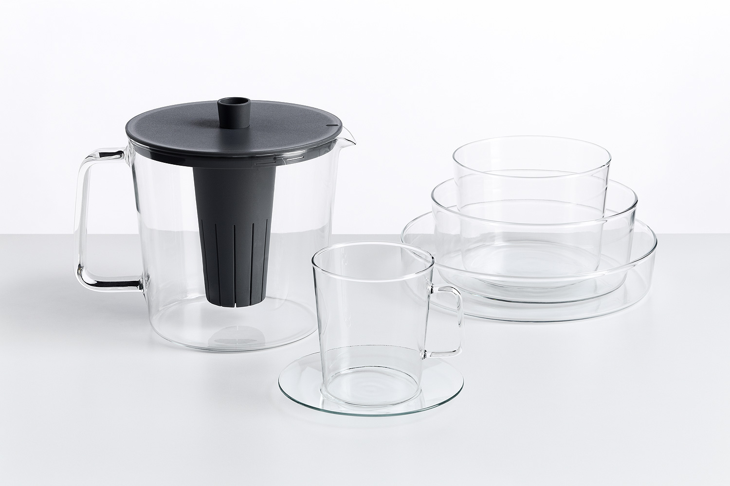 Definující rys kolekce KON je 5° úhel stěny skla a oušek. Je to jednoduchý ale charakteristický prvek, který se důsledně opakuje na všech částech kolekce. Skloněné ucho dokonale padne do ruky a pomáhá vyvážit sklo při nalévání či pití. Plastové doplňky jsou navrženy tak, aby perfektně pasovaly ke sklu svou praktičností a čistou estetikou.