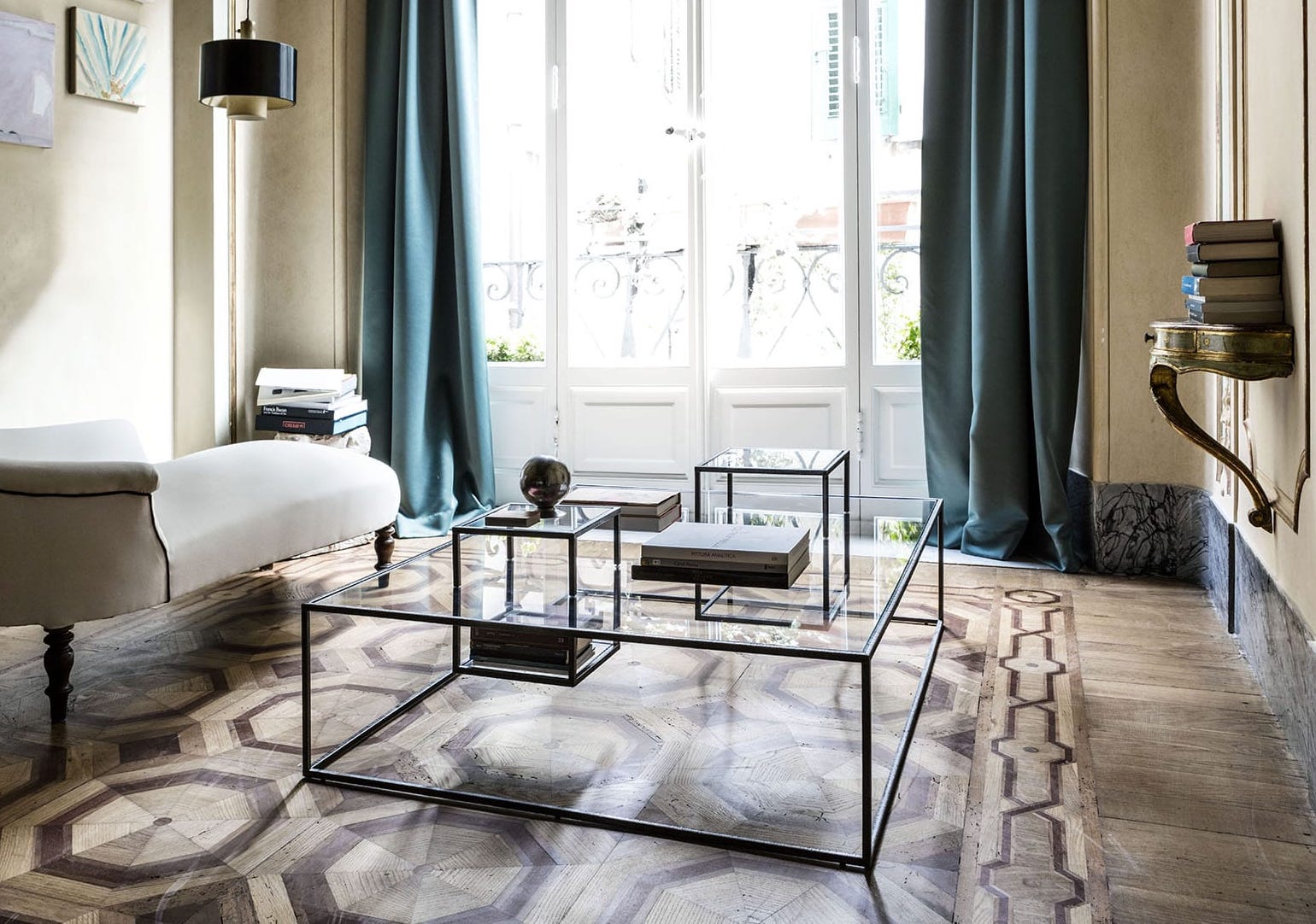 Konferenční stolek Illusioni. Byl navržen designérem Sebastianem Tosim pro značku Mogg. Má ručně vyráběný kovový rám a skleněné plochy.