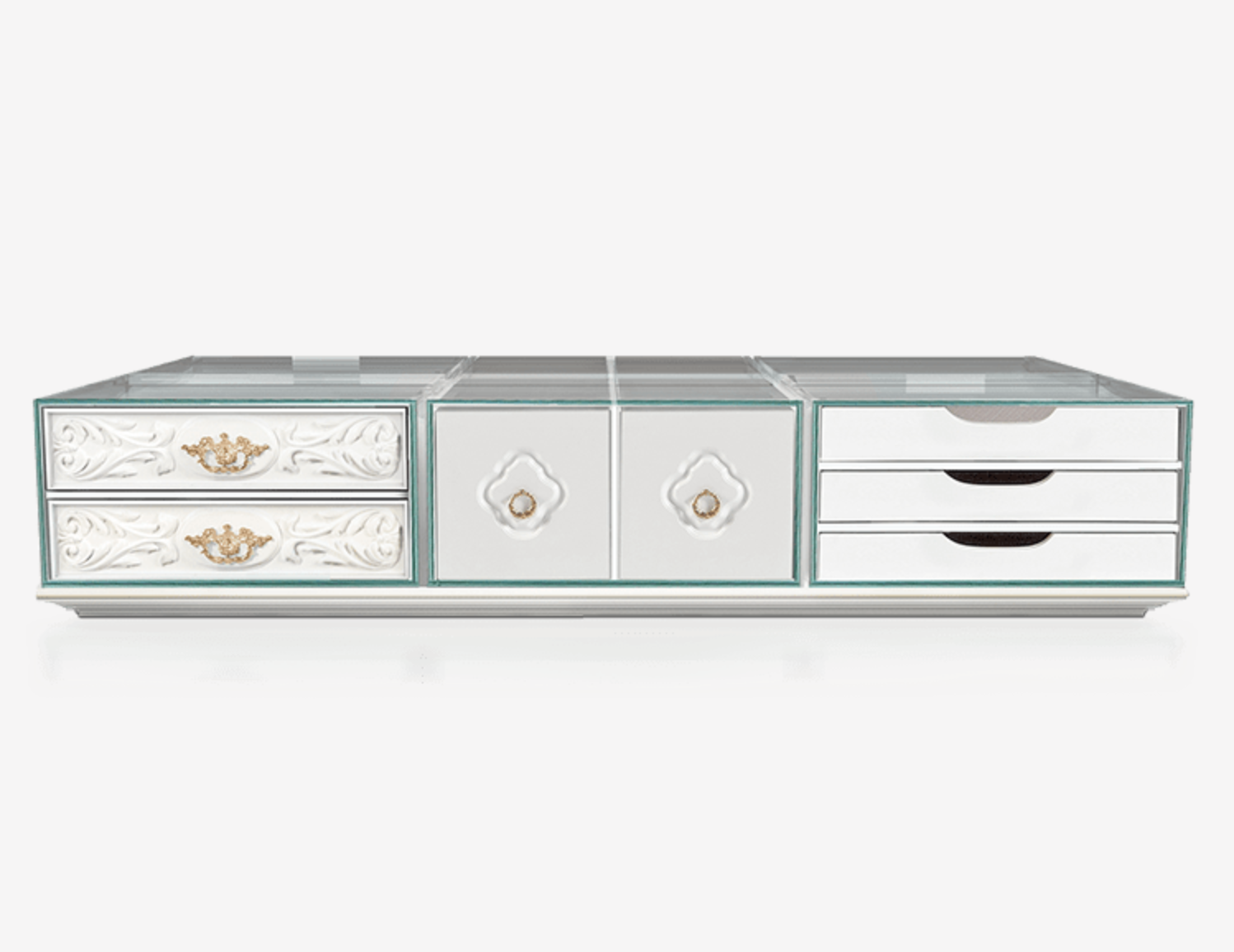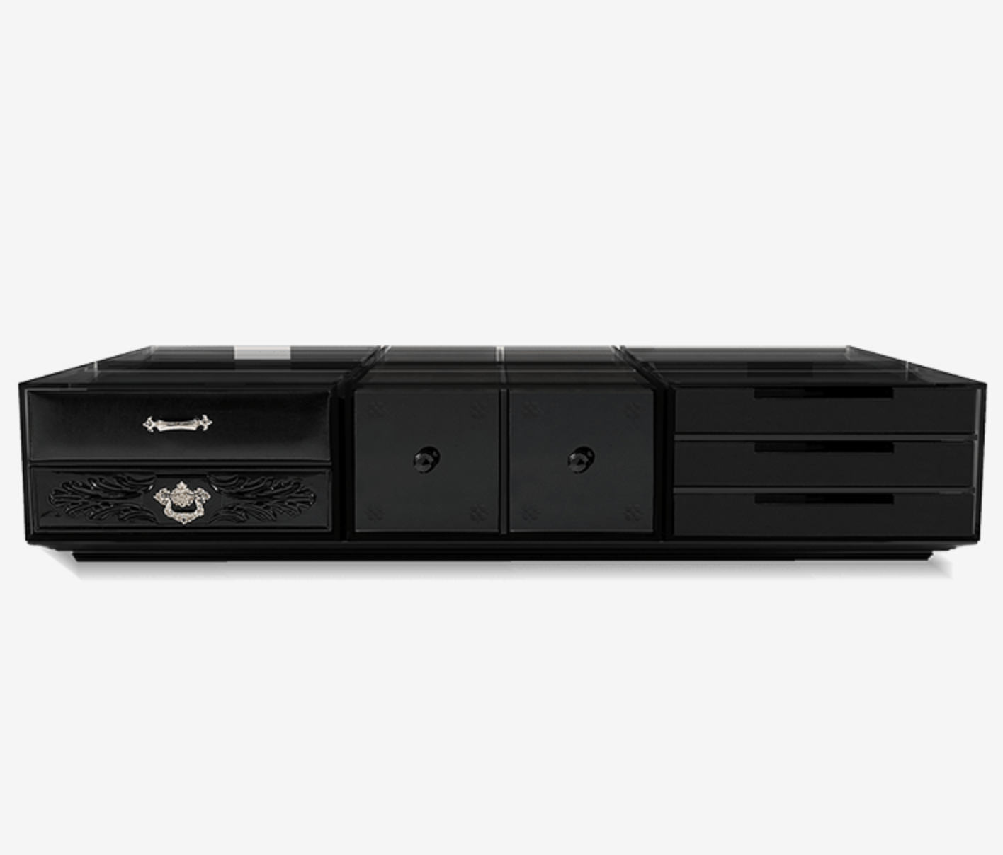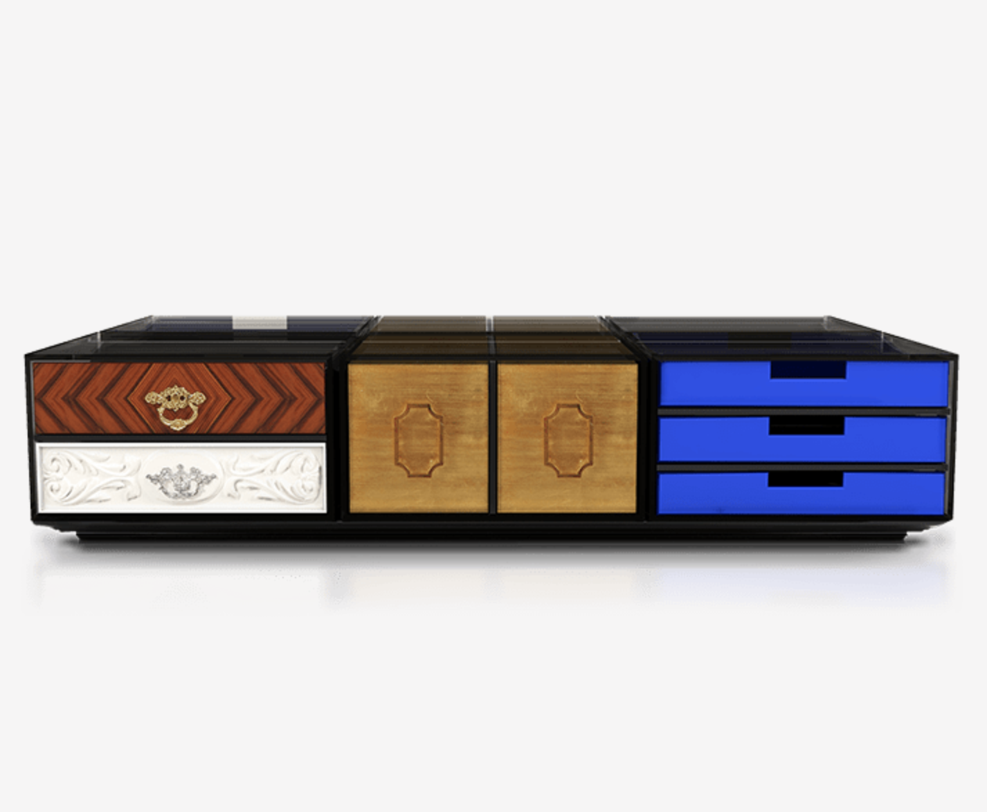 Tento konferenční stolek, který se skládá z 9 zásuvek, pracuje v modulárním systému, který vám nabízí možnost změnit polohu zásuvek, abyste si mohli vytvořit své oblíbené složení, kdykoli budete chtít.