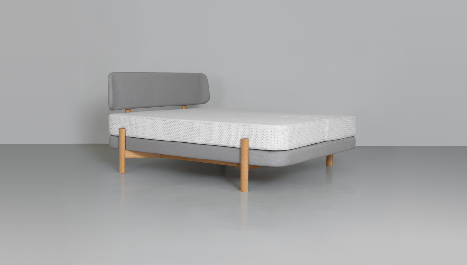 KOSI - neobvykle lehká postel. Inovativní je její konstrukce: pružinová podložka a matrace jsou z boků podepřeny eliptickými nohami a