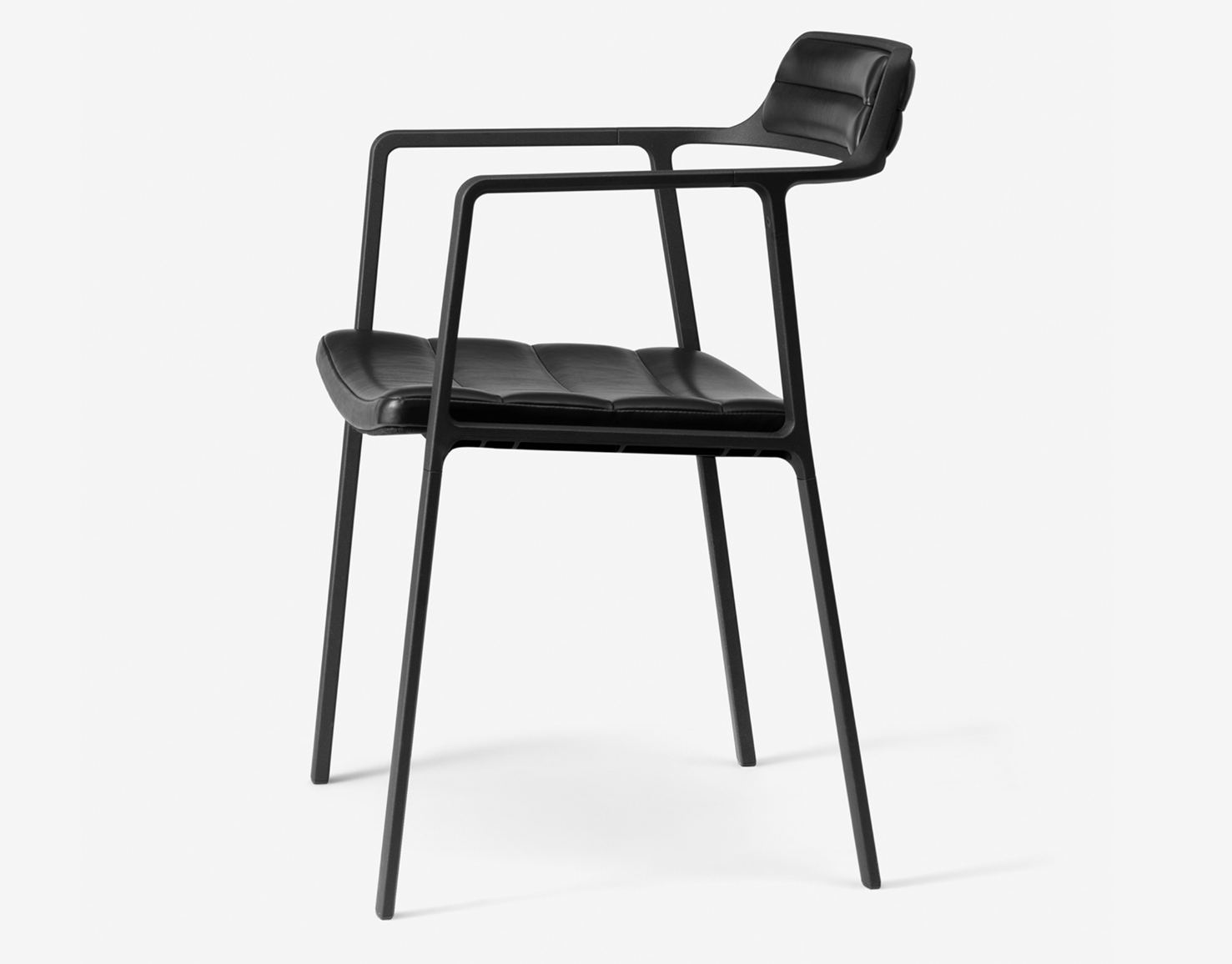 Židle Vipp je vhodná do jídelny nebo obývacího pokoje. Židle má lakovaný hliníkový rám se zaoblenými opěrkami a malým opěradlem. Čalounění kůže je k dispozici v černé nebo koňakové barvě.
