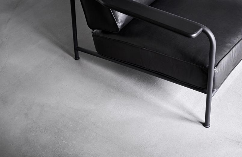 Křeslo Aero s odkazem na minulost, kdy cestování bylo luxusem. Kombinace kůže a ocelových nohou.