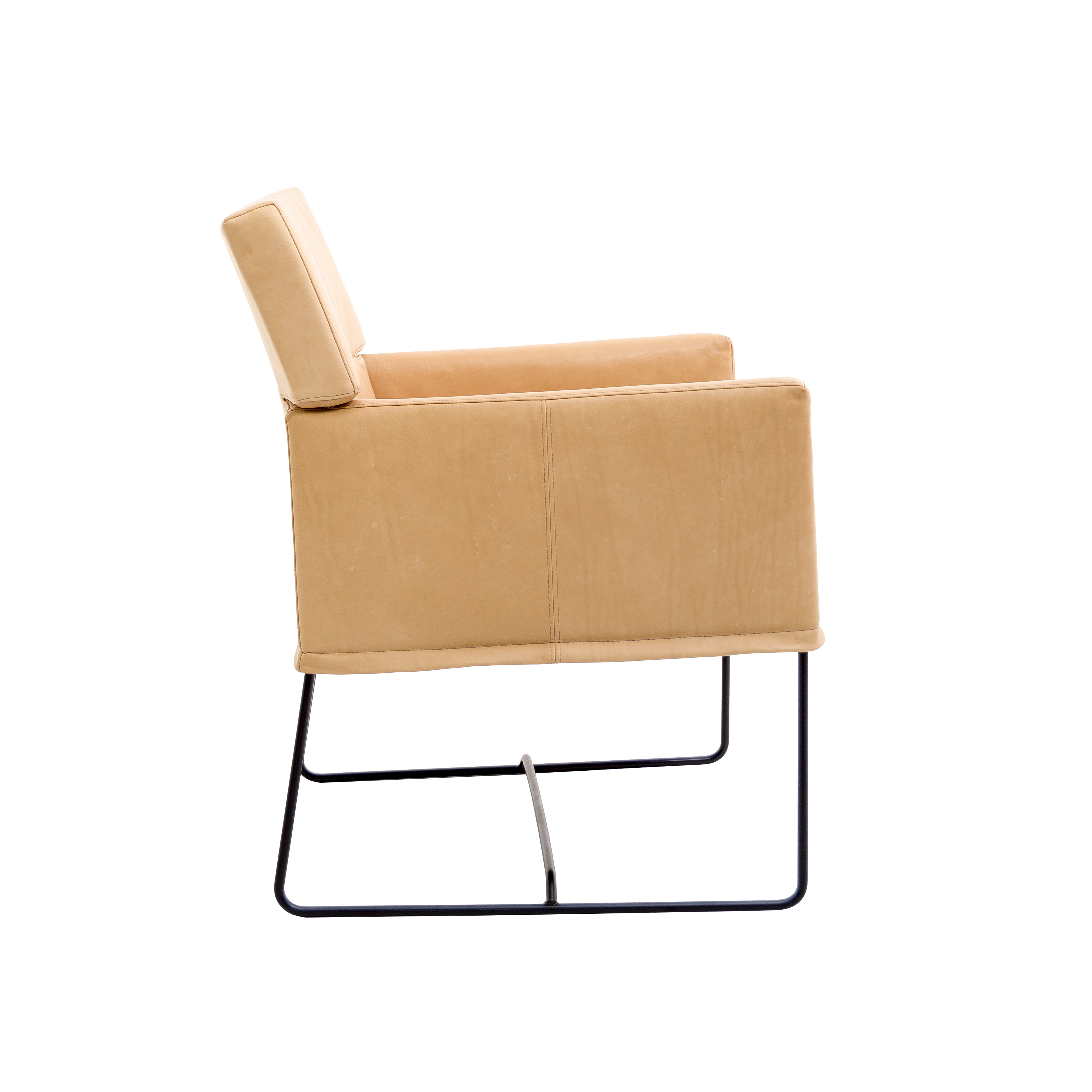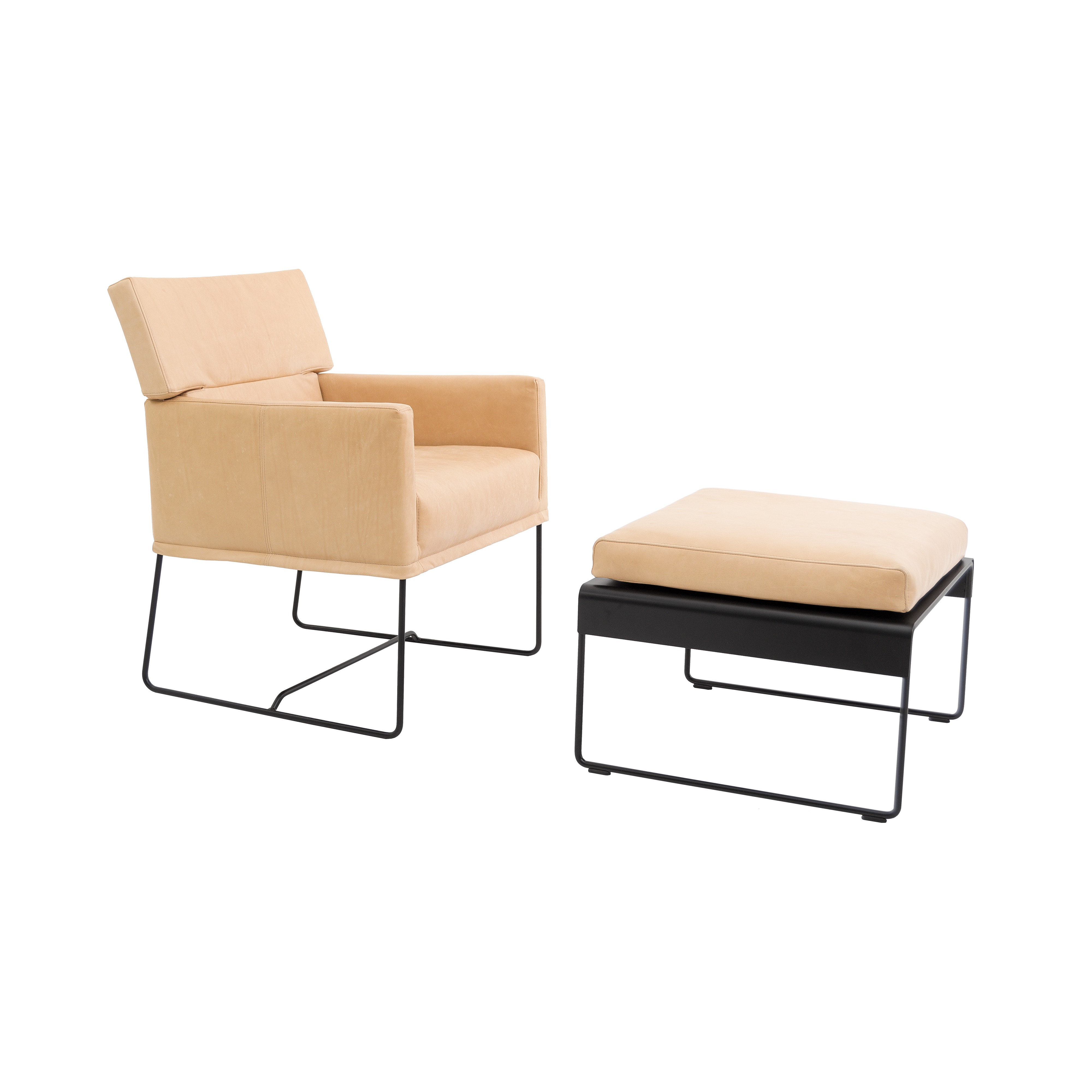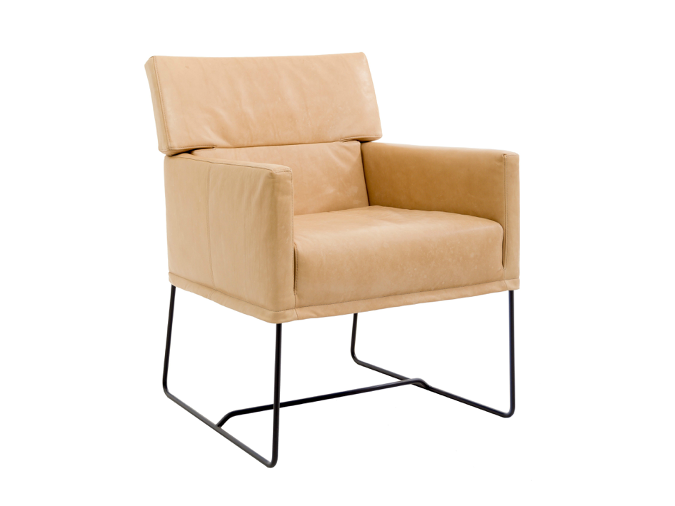 Kožené křeslo, připomínající tvar krychle, ležící na kovové konstrukci.