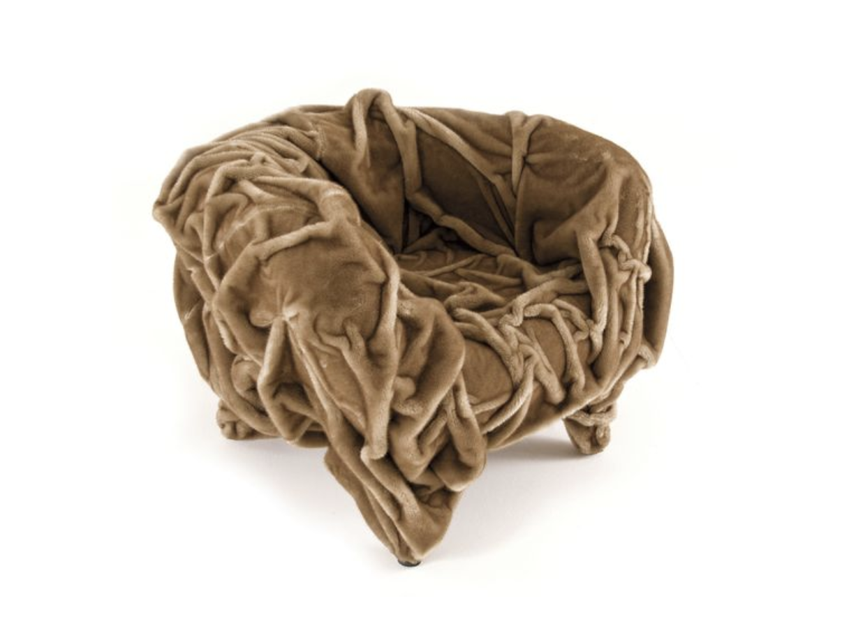 Polstrovaná židle s nízkým hřbetem. Je vyrobena z trubkového ocelového rámu pokrytého polstrováním a dokončena tak, aby se kryt držel na sobě ležérním způsobem, záměrně hojně. Závěs v kůži nebo měkké ekologické kožešině dělá každou židli jedinečnou.
