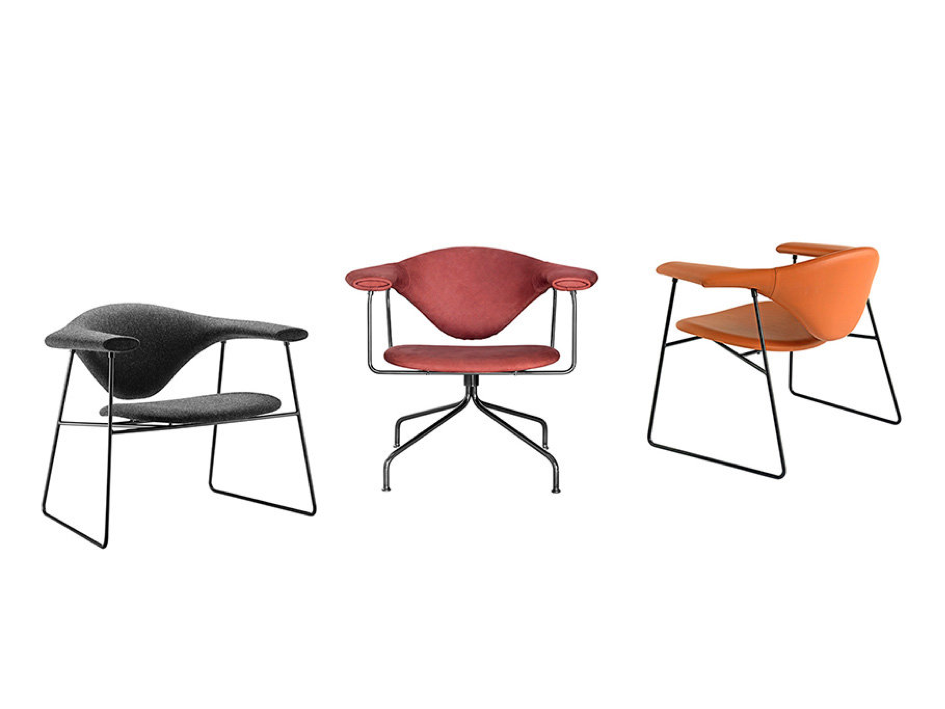 Křeslo Masculo Lounge bylo původně určeno do restaurace Copenhague at Maison du Danemark v Paříži. Štíhlé podnoží z nerez oceli má černé, práškově lakované dokončení. Polstrování sedáku, zádové opěrky i područek je možné vybírat z pestré škály látek i kůží. Křeslo ztělesňuje dánskou eleganci, ale i hravost.