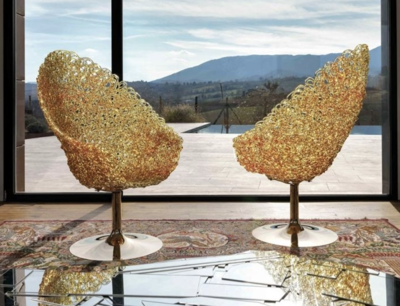 Díky polykarbonátu je křeslo Margherita, nejen vizuálně, lehké, vysoké a otočné, se zaoblenými liniemi a štíhlým tvarem. Plášť je vyroben zcela ručně a spočívá na kuželovém podstavci. Ve čtyřech barevných provedeních: jantarové, zlaté, akvamarínové modré a červené.