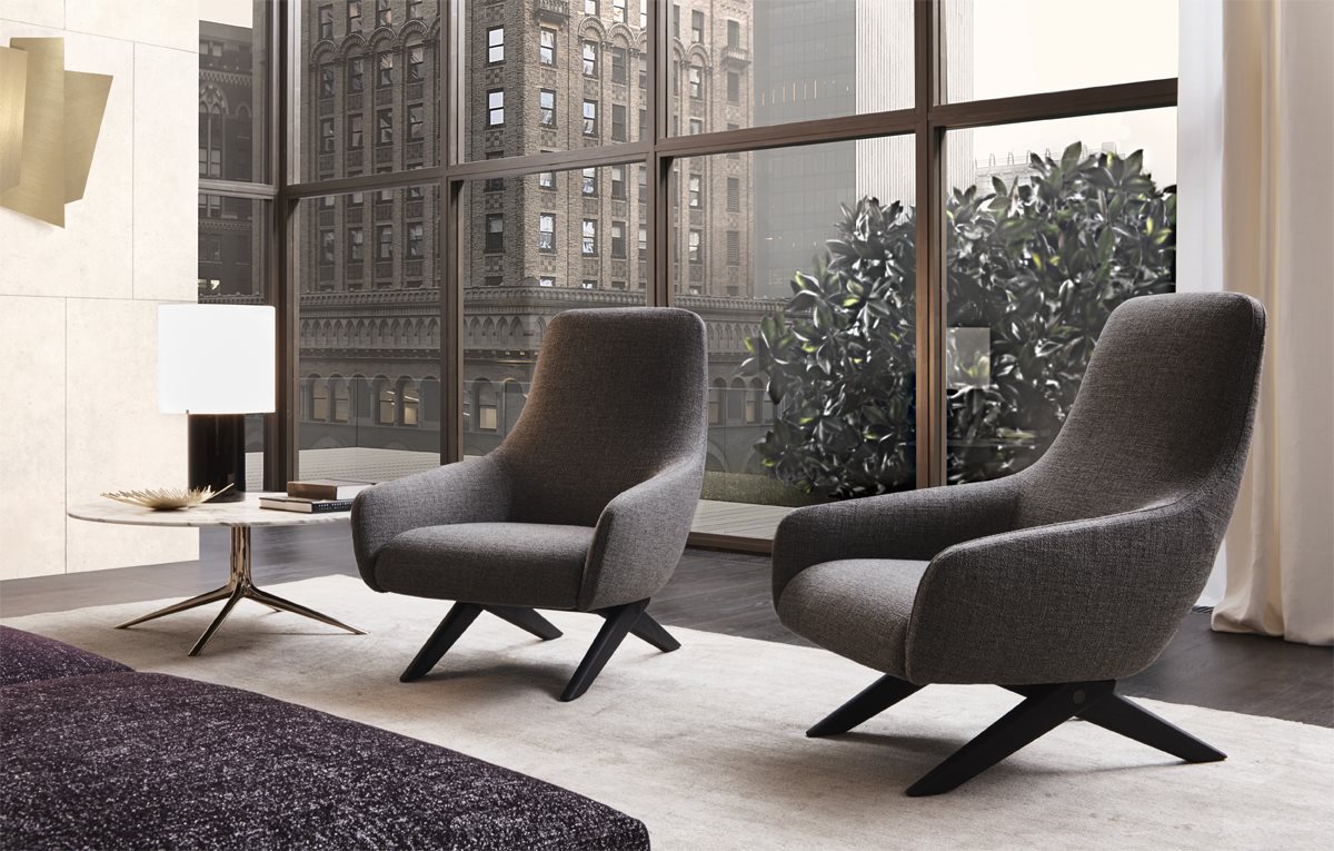 Křeslo s ergonomickým tvarem sedáku a dřevenou konstrukcí v minimalistickém designu.