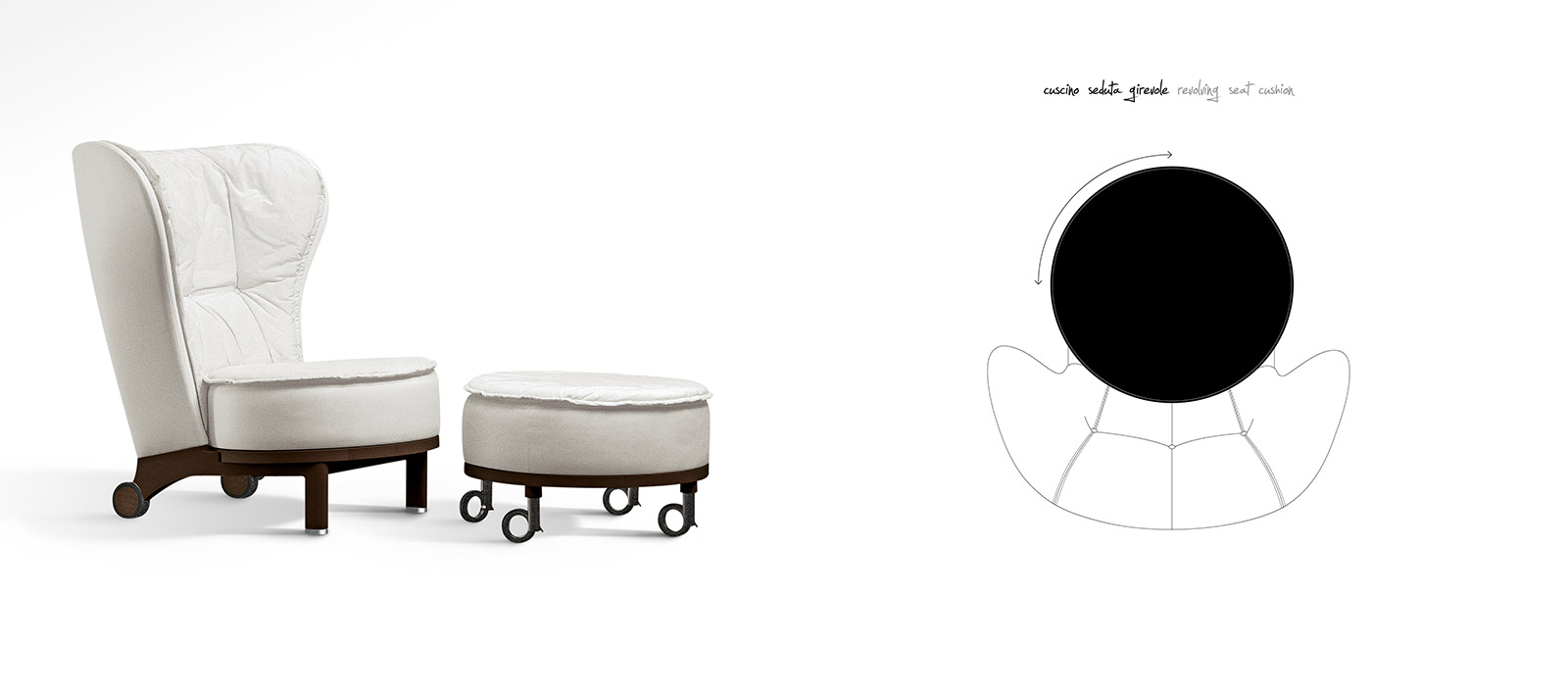 Základní rám je z leštěného masivního javoru. Rám okolo sedáku je z topolové překližky a polstrování je z nedeformovatelného přizpůsobivého polyuretanu s vlákniny. Čalounění je k dispozici v látkovém nebo koženém provedení. Křeslo je vybaveno otočnými koly, z proskleného poniklovaného kovu a šedé gumy.