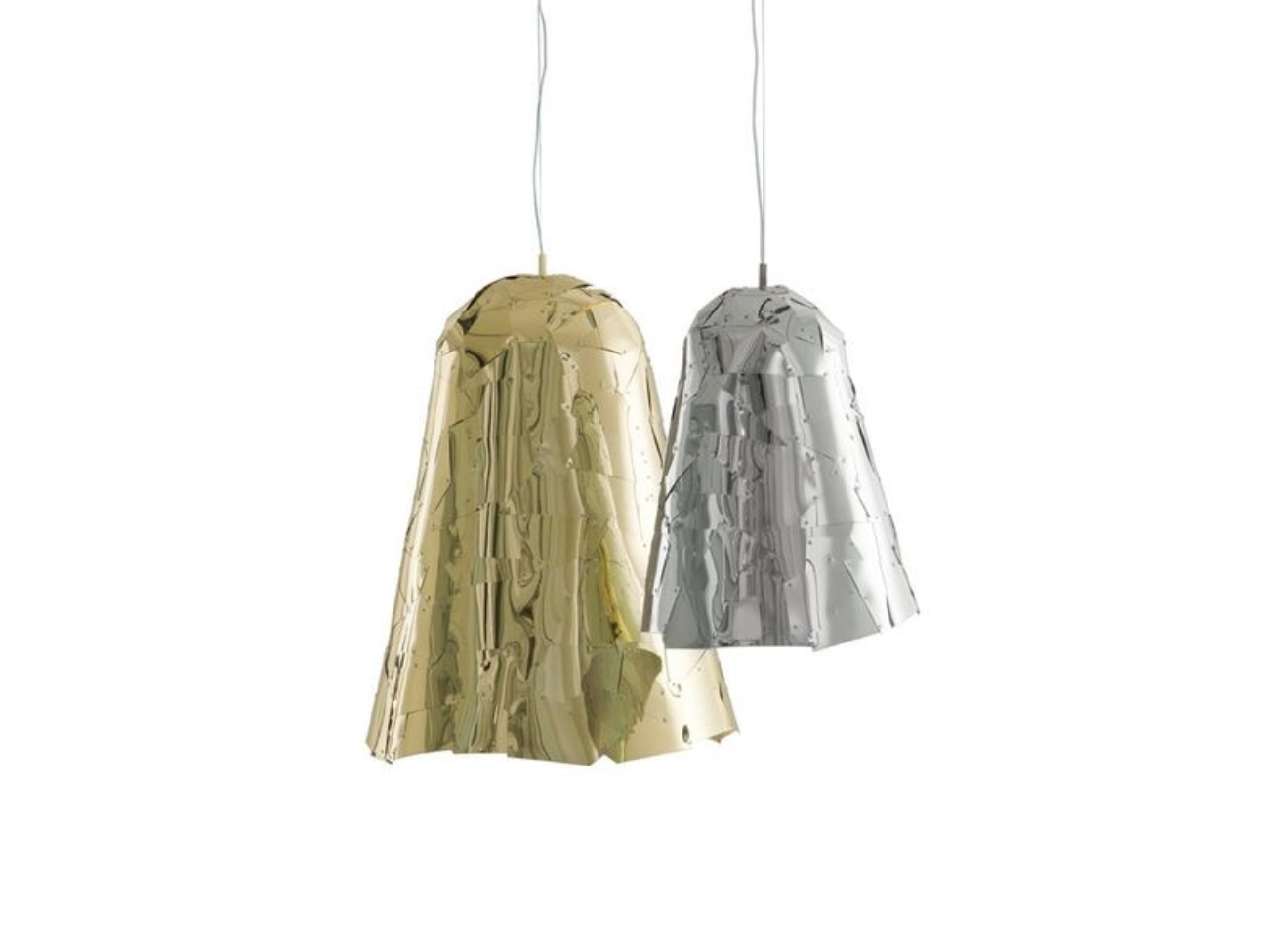 Závěsná lampa byla vyrobena montáží stovek nerezových, laserově řezaných hliníkových plechů, ručně spojených, aby vytvořily "zvon", který se vždy liší. Nekonečná hra světla a neocenitelných odlesků.