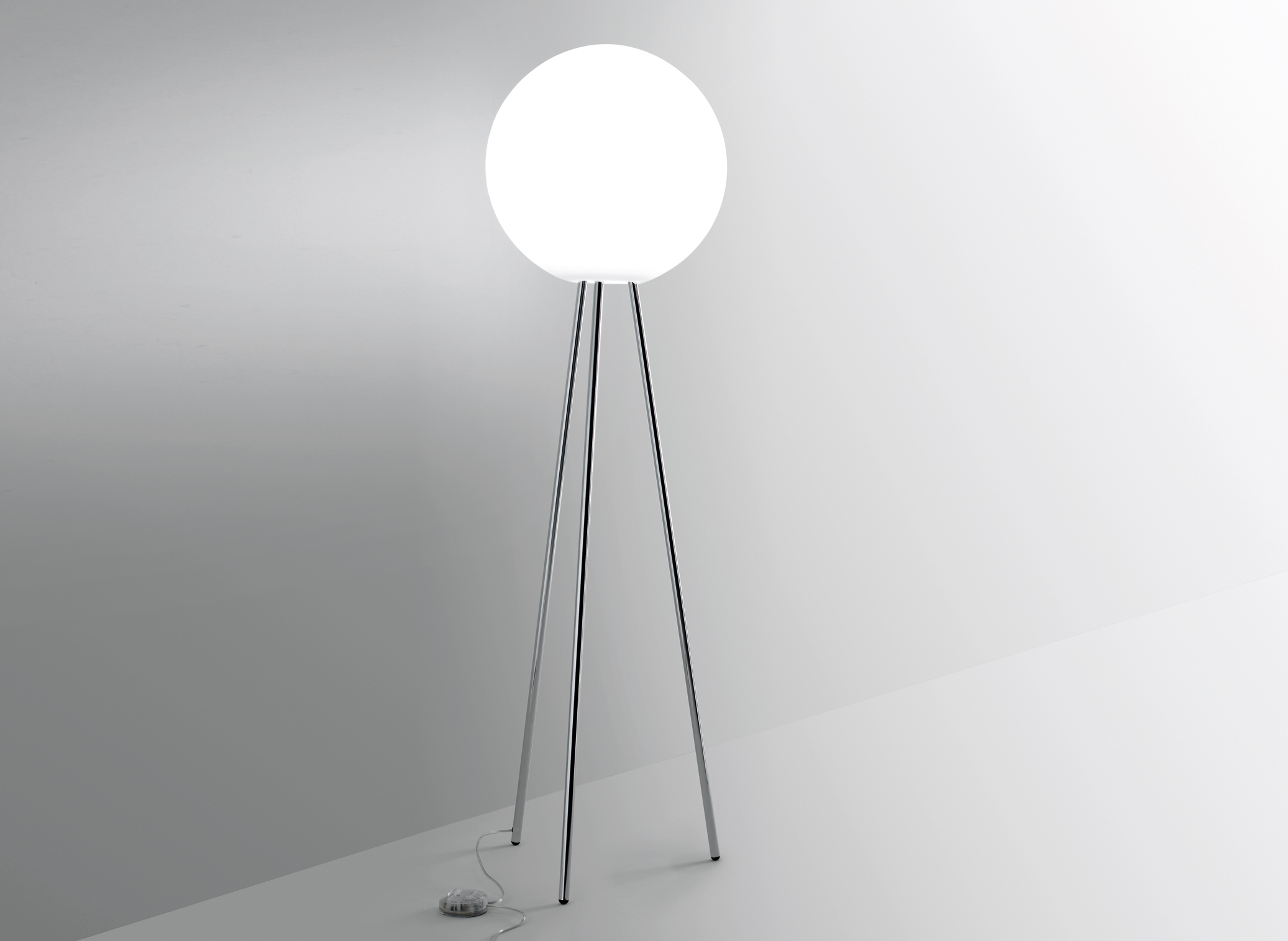 Velkolepý globus v bílém foukaném skle korunuje pochromovaný stativ. Uspořádání těchto linií vytváří velmi vyvážený výsledek.