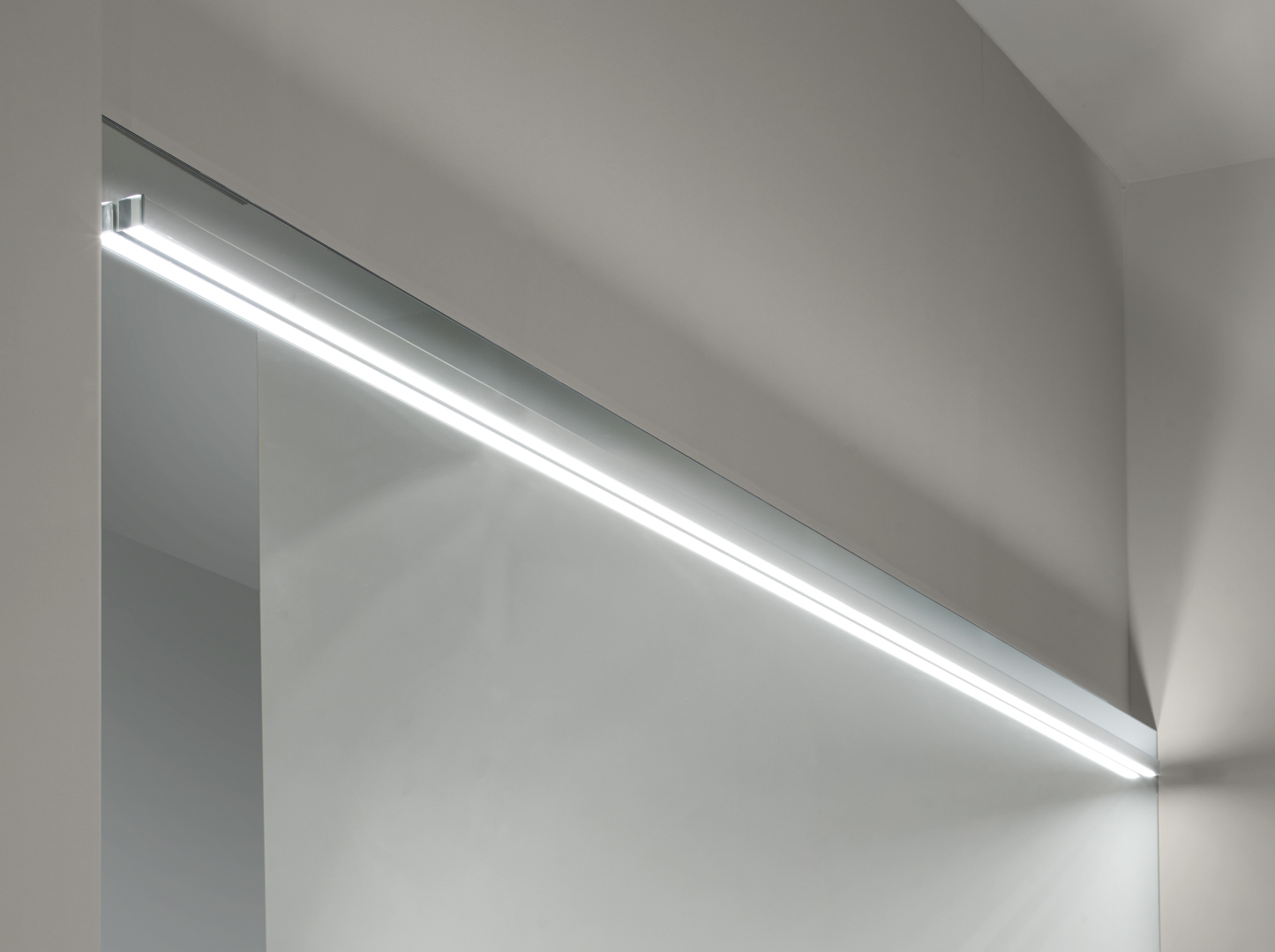 Lineární lampa z hliníku doplňující zrcadlo. Dvojité led osvětlení v dolní a horní hraně.