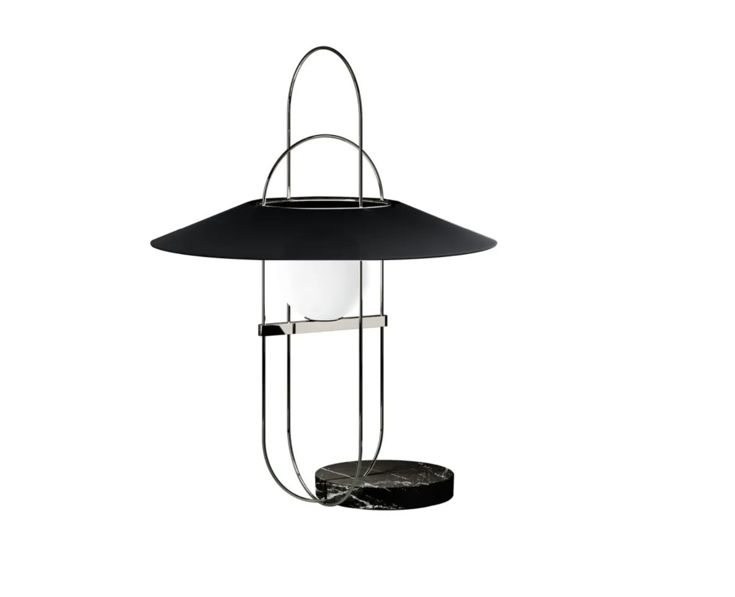 Lampa je složena z koule, magicky zavěšené v tenké kovové konstrukci. Hra kruhových hmot a trajektorií vytváří vyvážený design gravitační dynamiky.