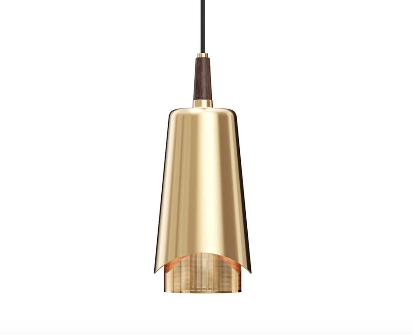 Toto závěsné světlo, navržené Arthurem Umanoffem, osvětluje kontrasty vytvořené při setkávání dokonale symetrických, geometrických prvků z mosazi a ořechového dřeva.