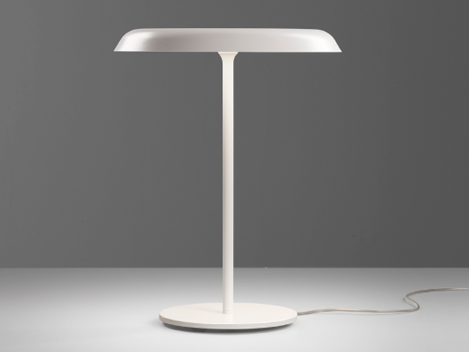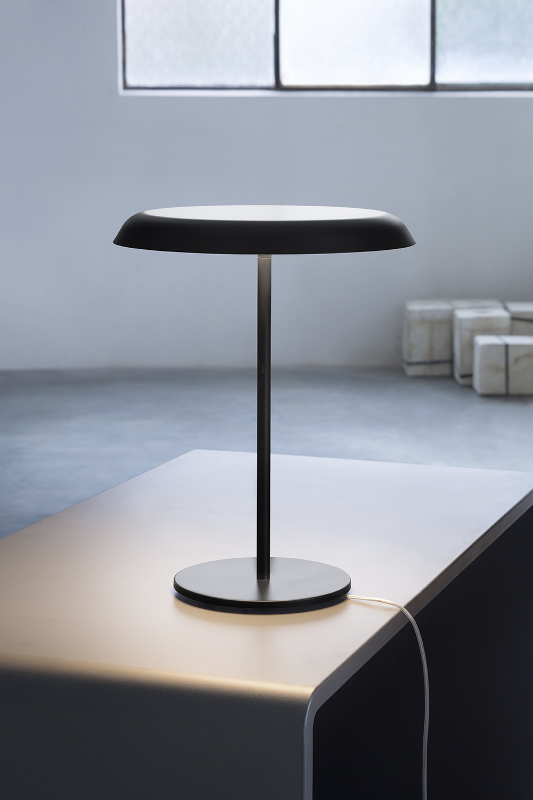 Zajímavě tvarovaná stolní lampa s přímým spodním osvětlením.
