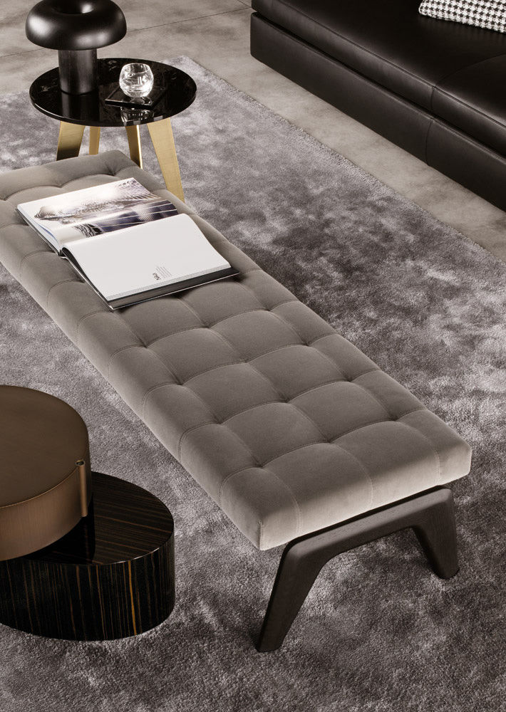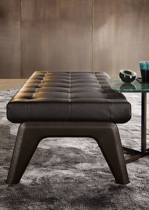 Lavice Kirk s dřevěnou základnou, která je k dispozici v délkách 138,5 a 183,5 cm. Kožené a sametové verze mají efekt všívání, kde švy vytvářejí geometrický vzor čtverců, zatímco u textilní-čalouněné verze mají jemný prošívaný design.