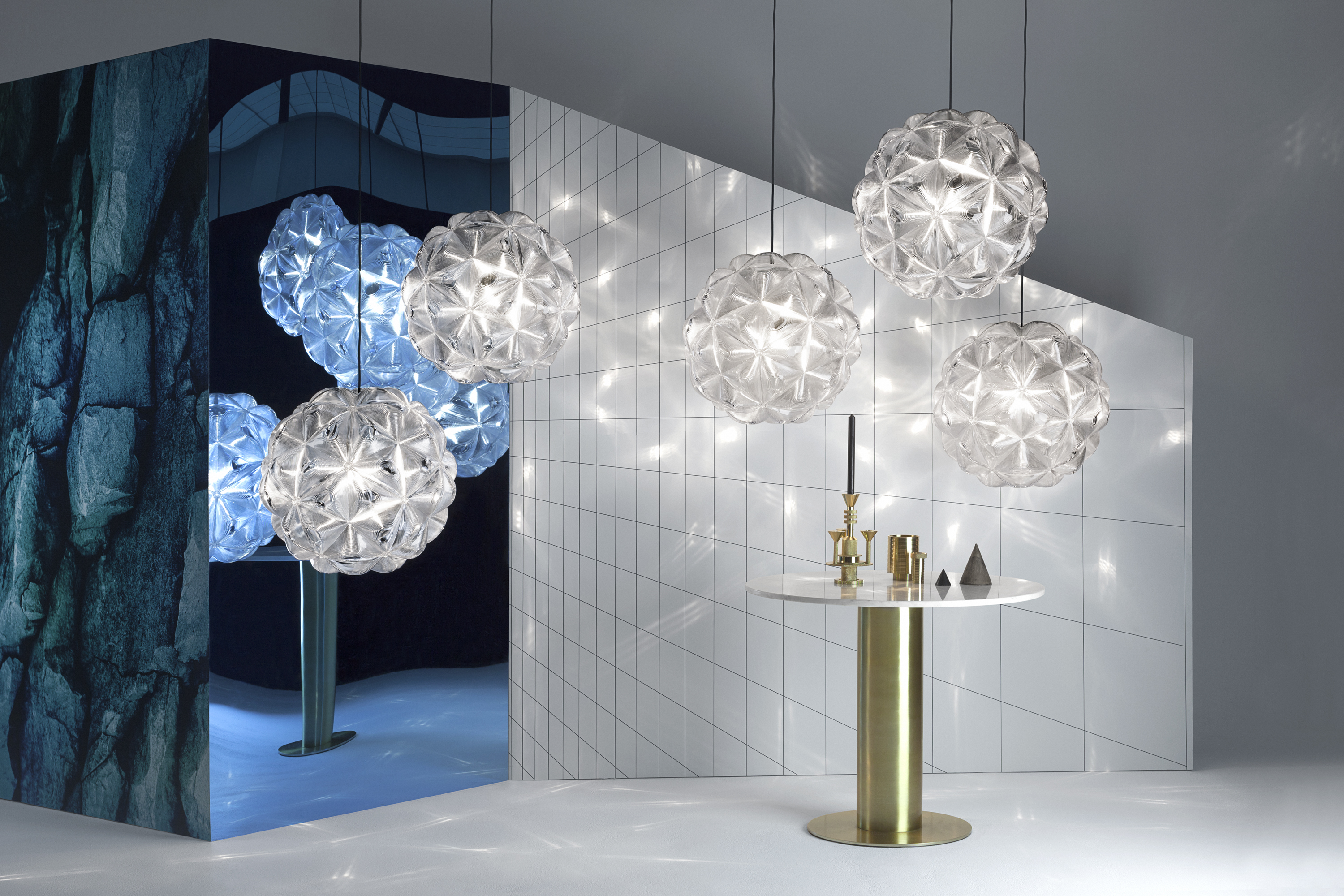 Nejnovější produkt inspirovaný geometrií a zářivostí. Kulovitý lustr vyroben ze 60 polykarbonátových čoček, ve kterých se láme světlo zdroje se zajímavým efektem.