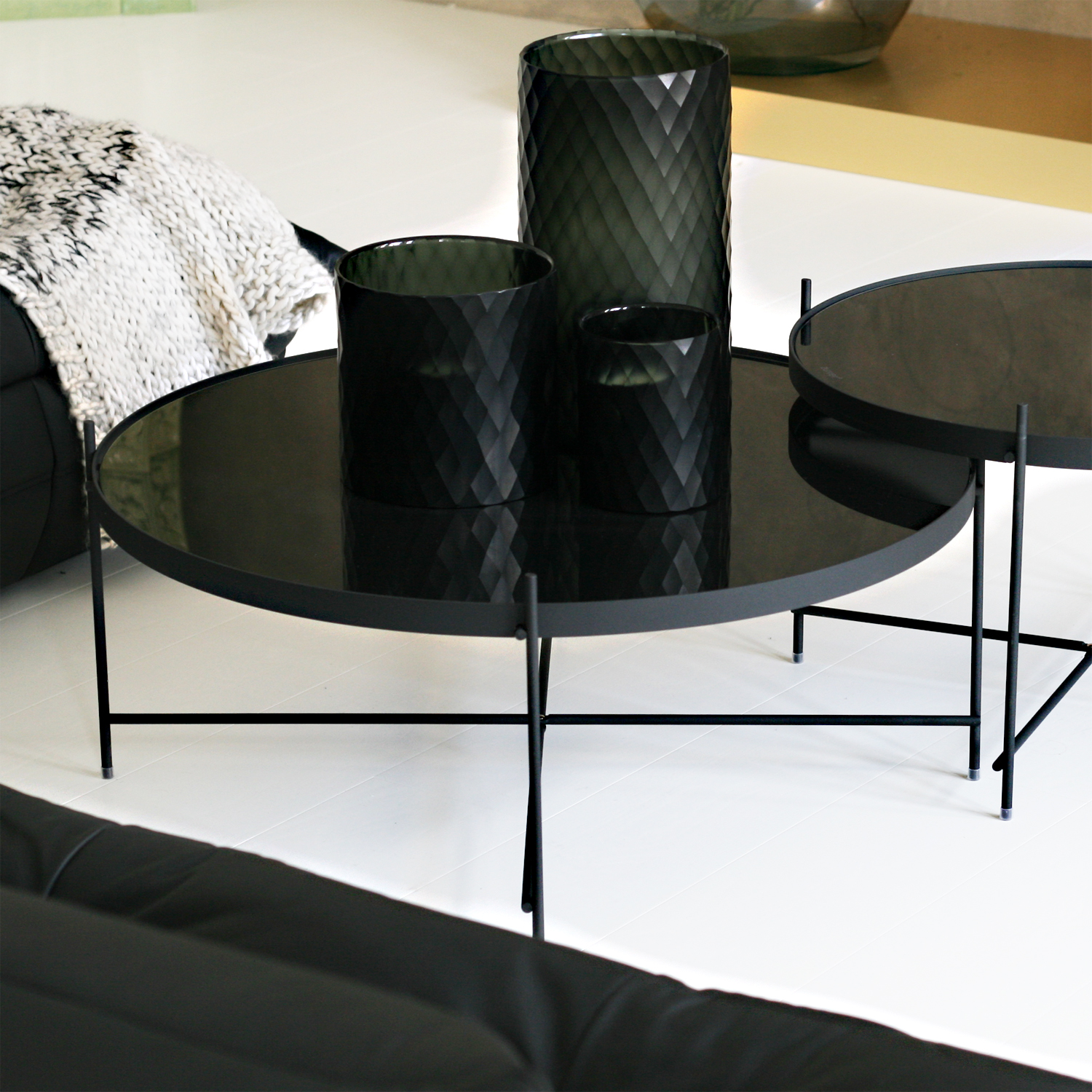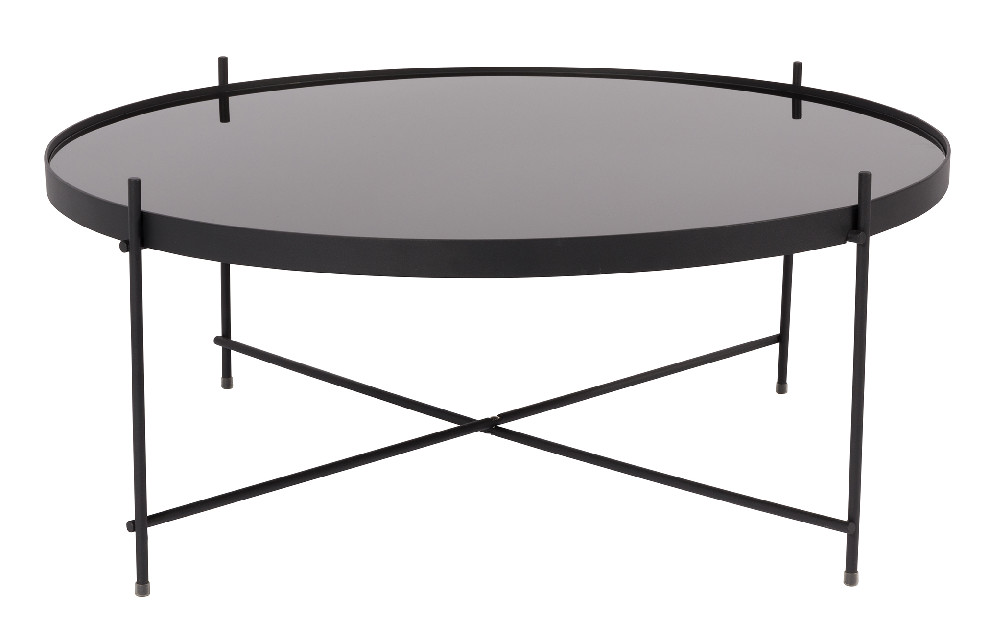 Odkládací velký kulatý stolek s černou skleněnou deskou a křížovou nohou.Nízký a široký.