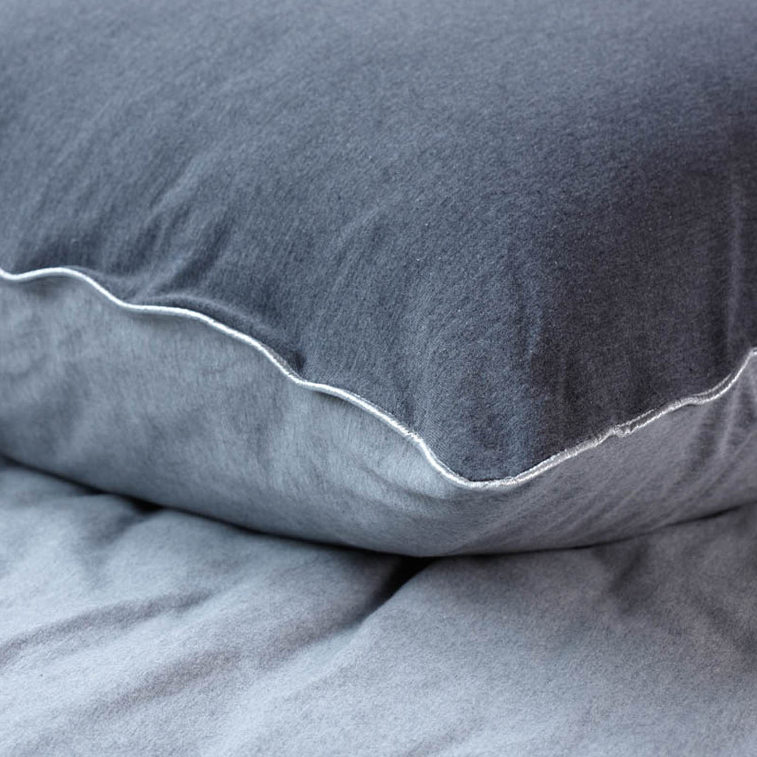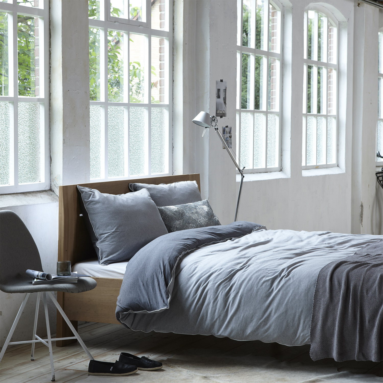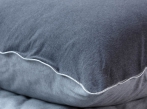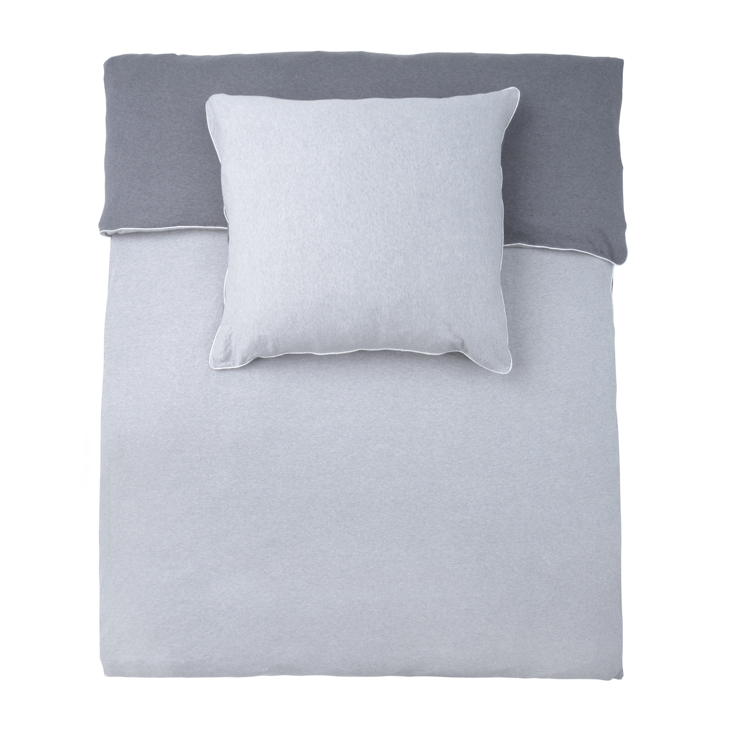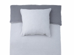 Povlečení na postel s francouzskou peřinou z jedné strany světle šedé a z druhé tmavě šedé se stříbrným okrajem.