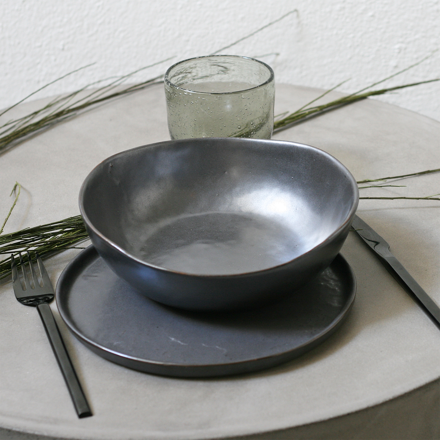 Elegantní salátová miska z porcelánu v černé barvě s lehkým bronzovým nádechem a nepravidelným okrajem.
