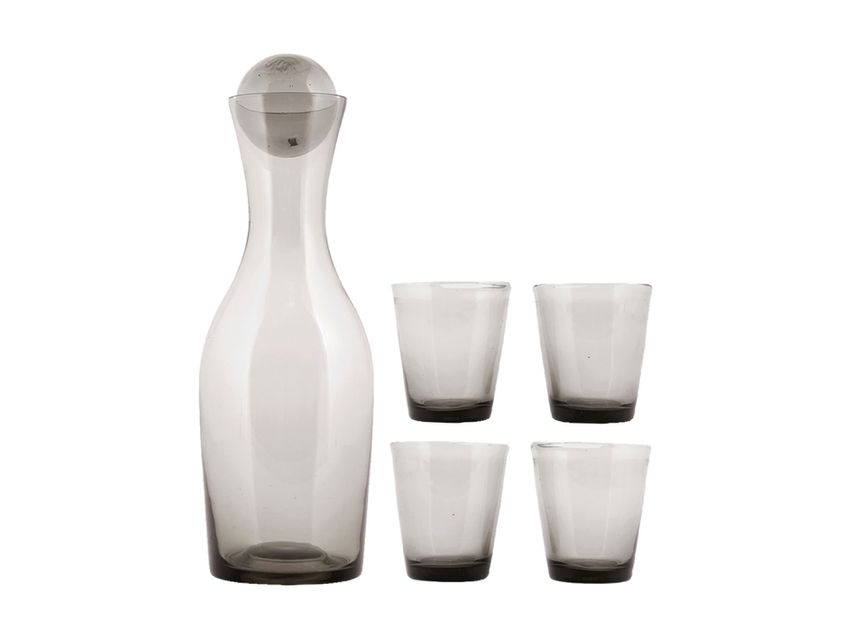 Set karafy s kulatým uzávěrem a čtyřmi kusy sklenek ze šedého skla.
