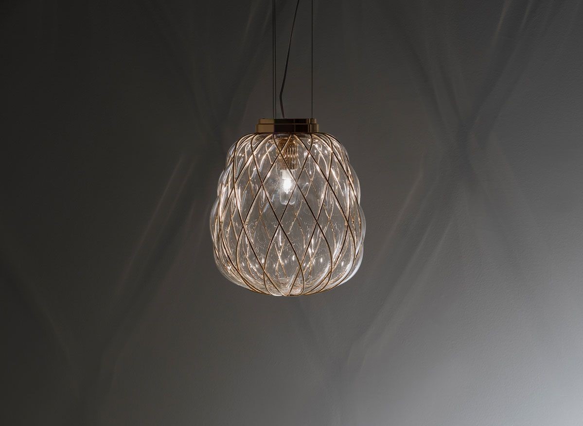 Pinecone je závěsná lampa a je k dispozici v lesklé, průhledné nebo mléčně bílé verzi. Koule se vyrábí za použití staré techniky foukaného skla: výrobník skla fouká roztavenou skleněnou kuličku do kovové klece. Skleněná koule je částečně zachycena a částečně uniká z klece, a vytváří tak dojem napětí.