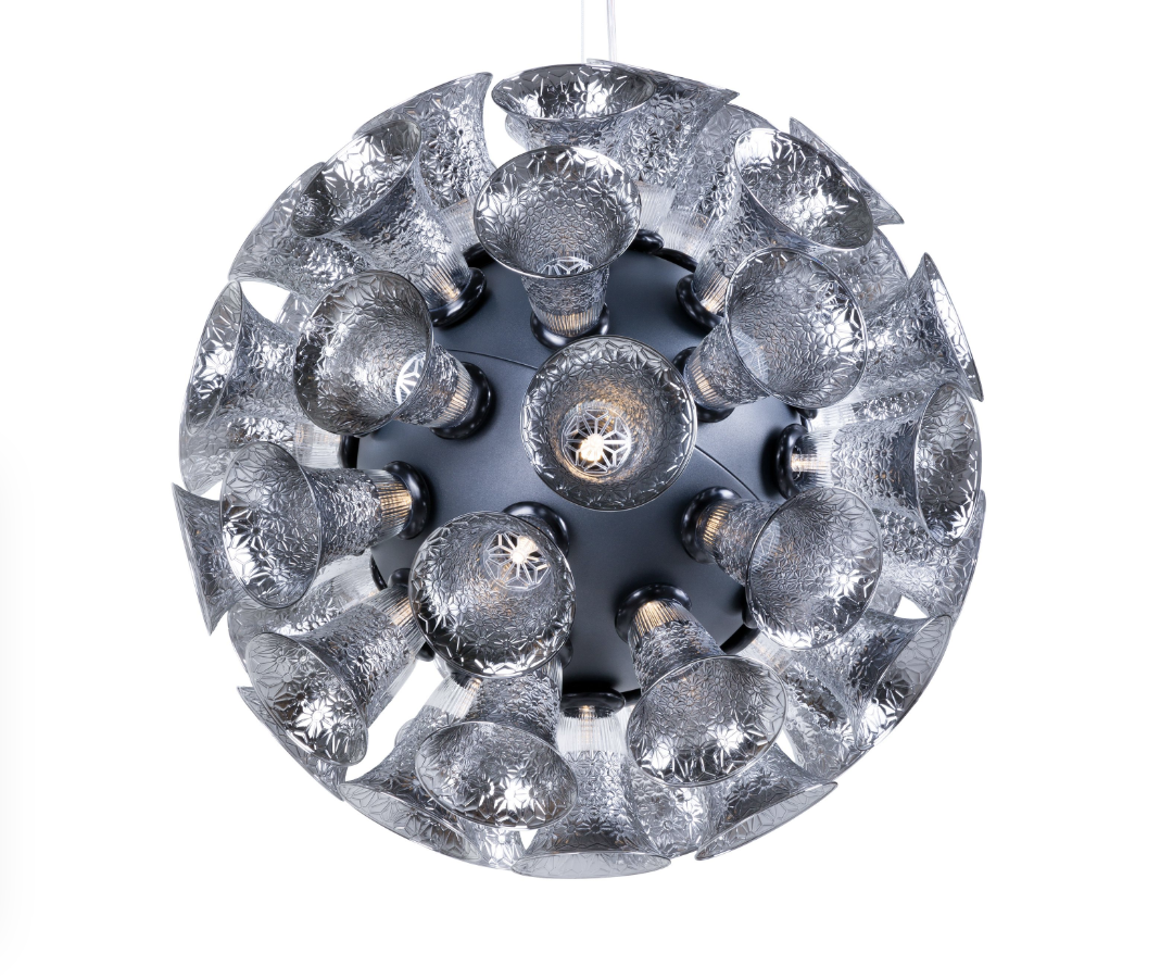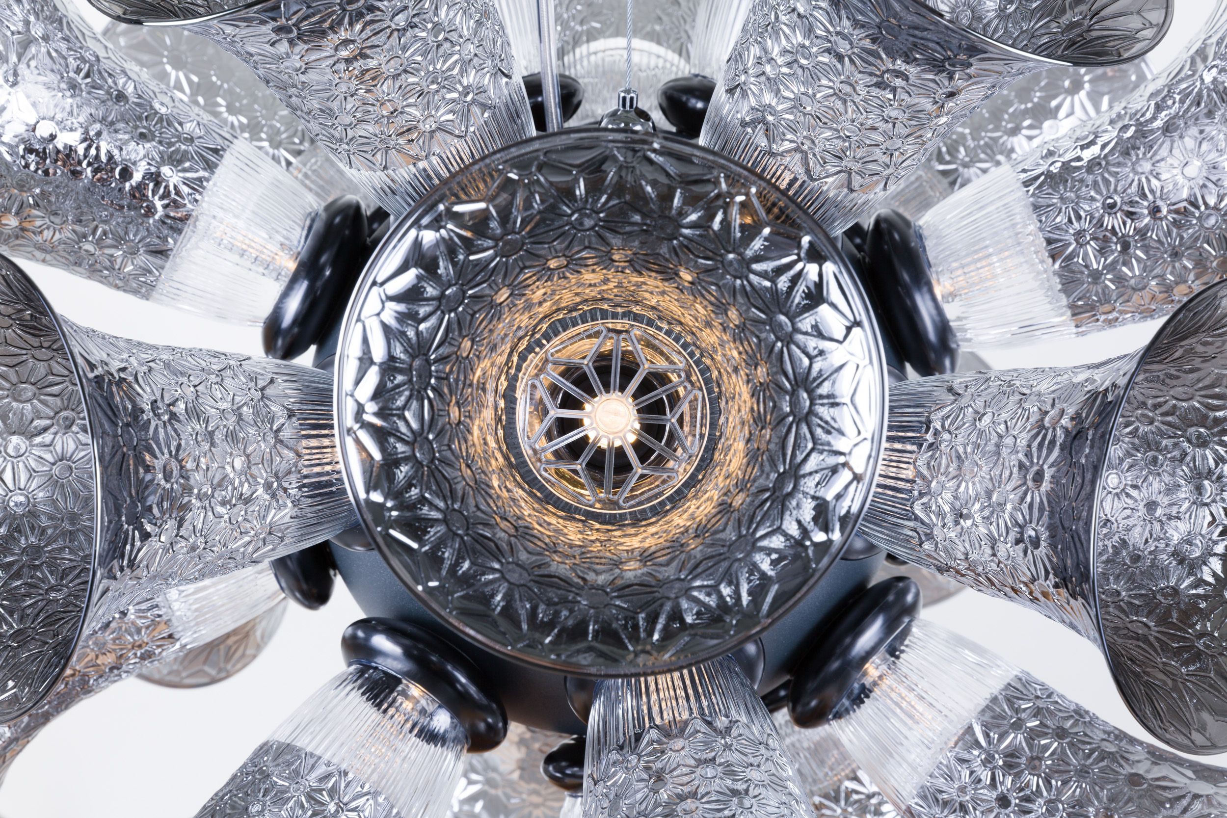 Jemná krystalická krása lustru Chalice 48 je zdokonalena měkkým kovově šedým tělem a kroužky v černé barvě na bázi průsvitného skla.
