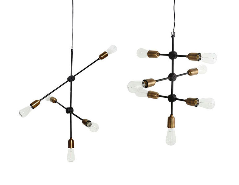 Lustr Molecular je z vyroben z černě lakované slitiny oceli a mosazých detailů. Jednotlivá ramena se dají různě nastavit. Na výběr ze dvou velikostí. Žárovky nejsou součástí balení.