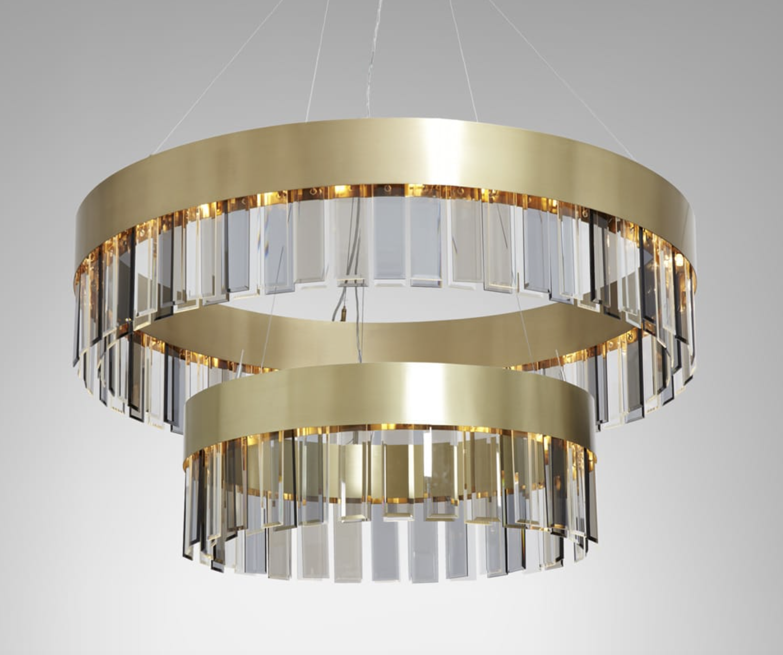 Broušené sklo, které je upevněno po obvodu mosazného prstence, je vyrobeno z kombinace čirého a zakaleného skla bronzové barvy. Tento lustr je také možno přizpůsobit na míru.