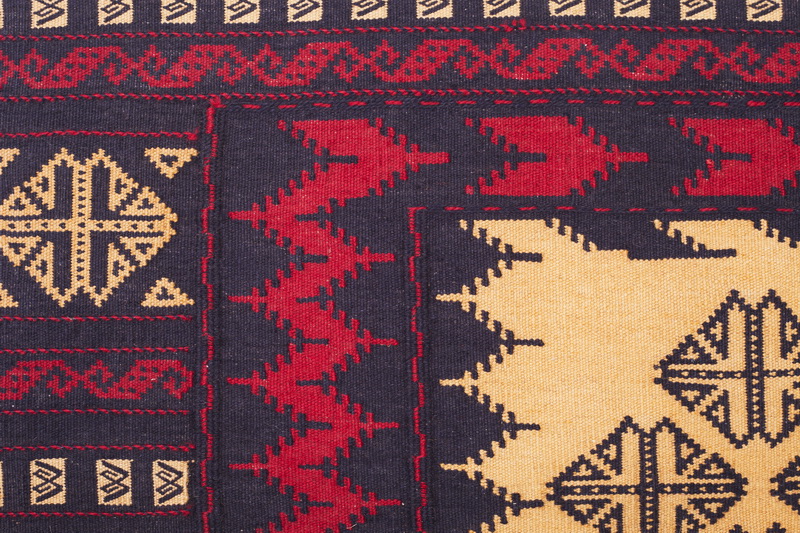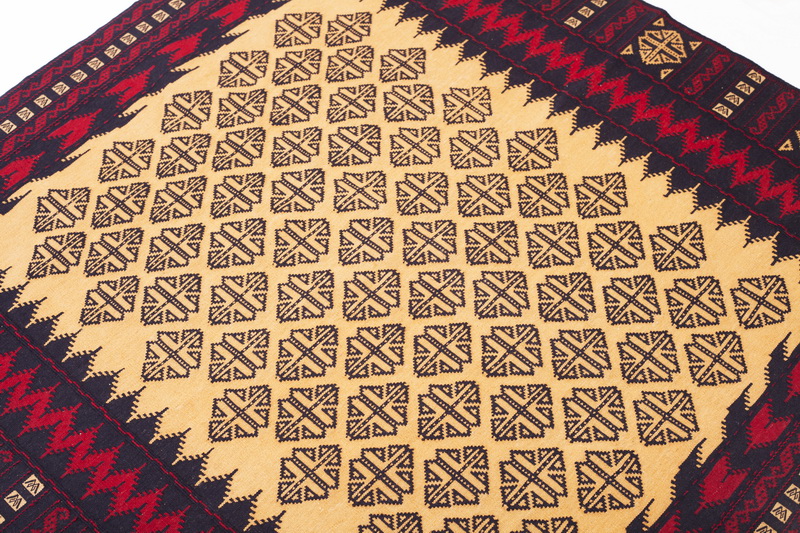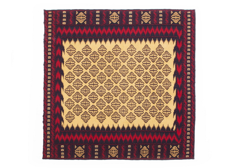 Tento krásný dekorativní sofreh kilim ozdobí váš oblíbený kout či stěnu. Přírodní barvy na čtvercovém koberci rozzářila výraznější červená, díky ní působí opravdu svěže. Tento nevšední kus utkala z kozí vlny balúčská rodina v afghánské provincii Farah.