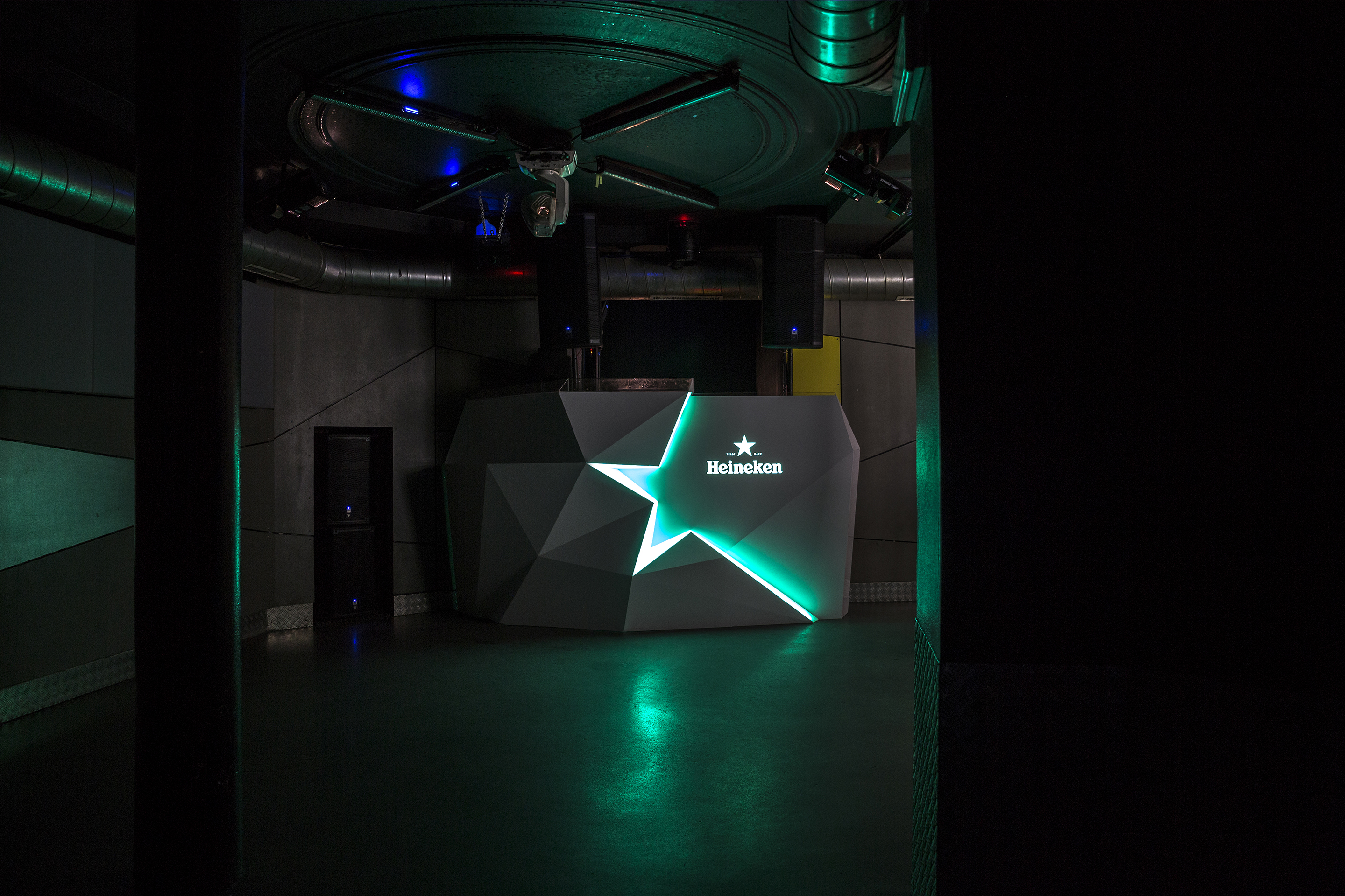 DJ pult je navržen tak, aby respektoval stávající prostor a zároveň dobře splňoval účely brandingu. Tvar je vystavěn z plechových plátů, které obepínají původní betonový blok a jsou spojeny v jeden celek. Kompozici tvoří dva bloky, které do sebe jakoby naráží s jejich střet tvoří světelnou hvězdu.