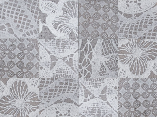 Odolný materiál od Nero Sicilia s vzhledem tradičních krajek a tkanin, které jsou položeny na lávový kámen sítotiskem a vytvářejí dvě jedinečné a hmatové série, iRicami a iTessuti.
